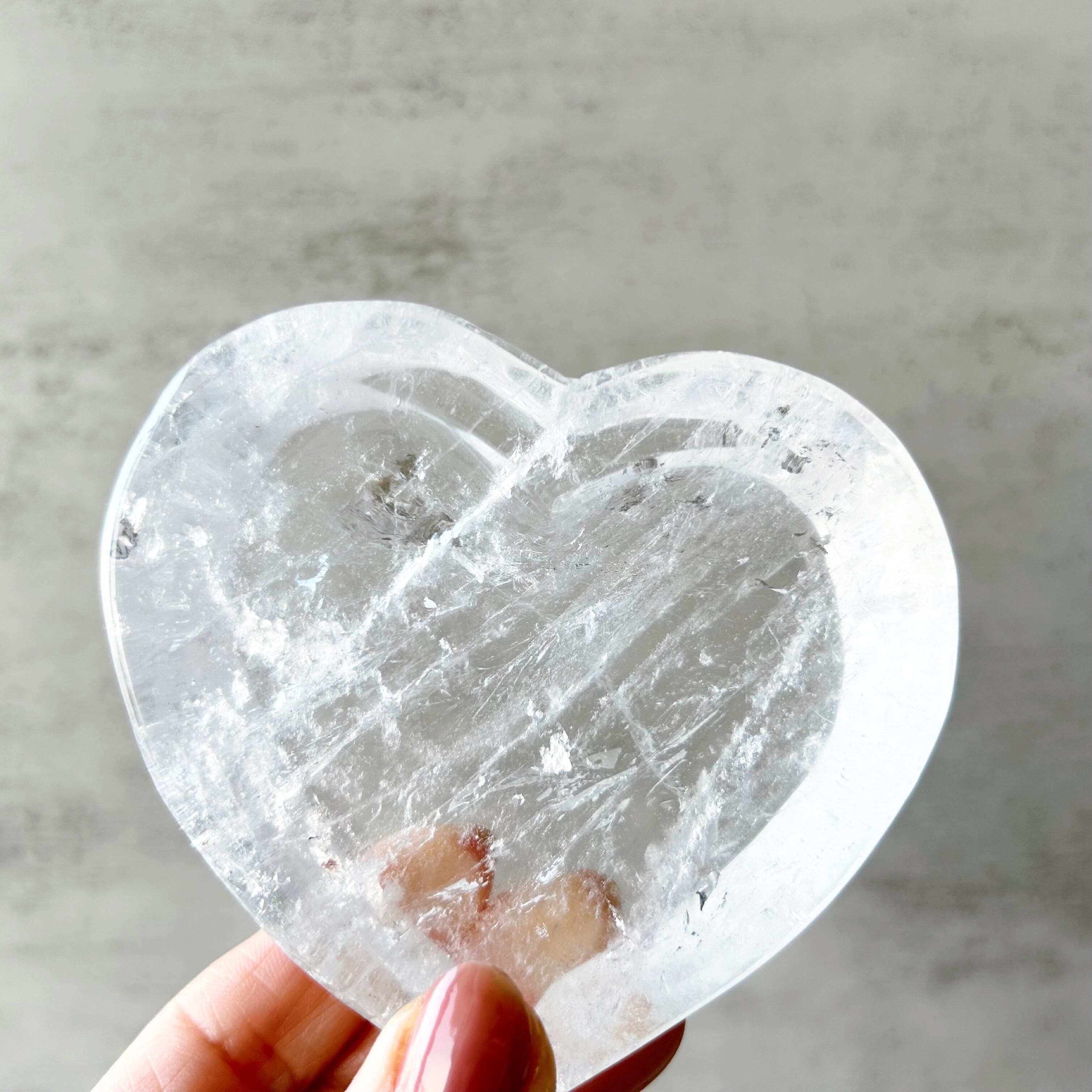 クリアクォーツのハート型トレイです。アクセサリーや天然石の浄化など、使い方は自由自在です。レインボーも見られます。