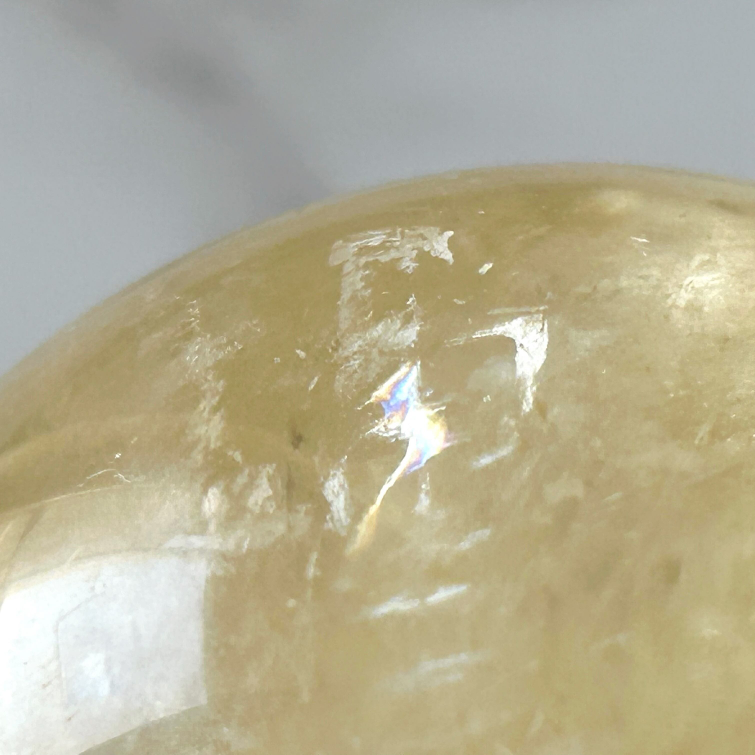 美しいシャンパンゴールドカラーのゴールデンカルサイトのスフィア(丸玉)です。虹も見られます。クリアガラスのスフィアスタンド付きです。