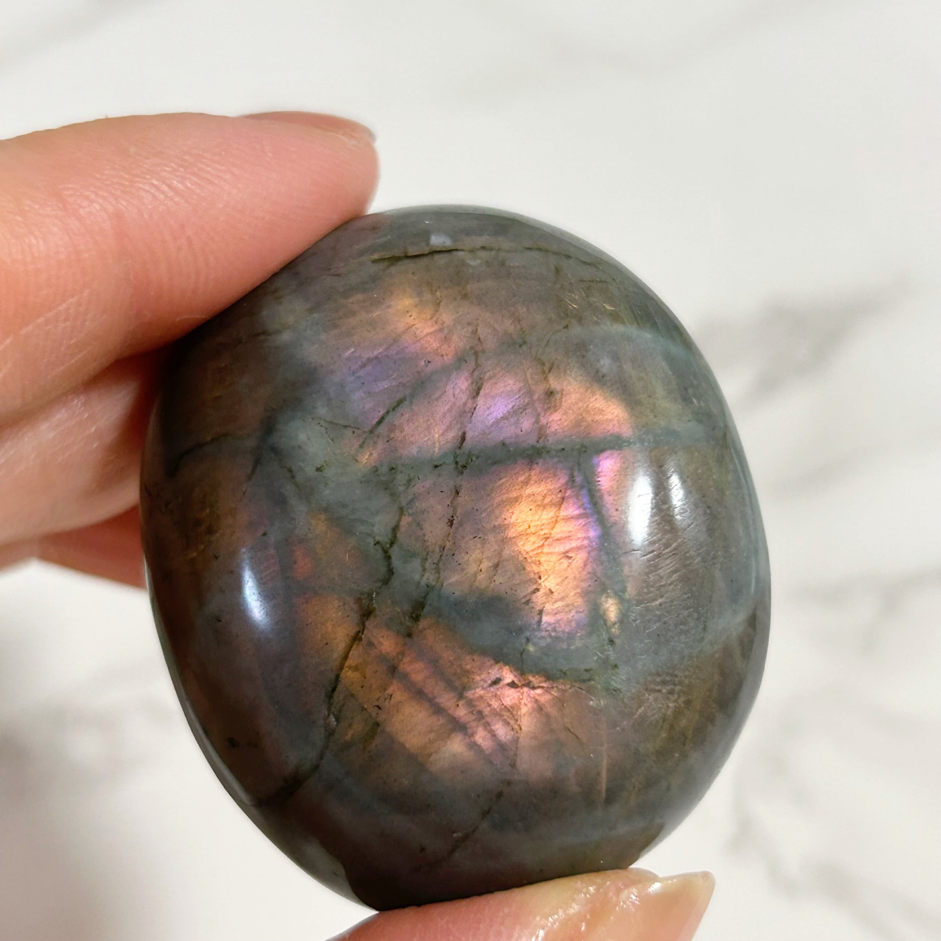 ラブラドライトのパームストーンです。ピンク、オレンジ、パープルのシラーがとてもキレイです。