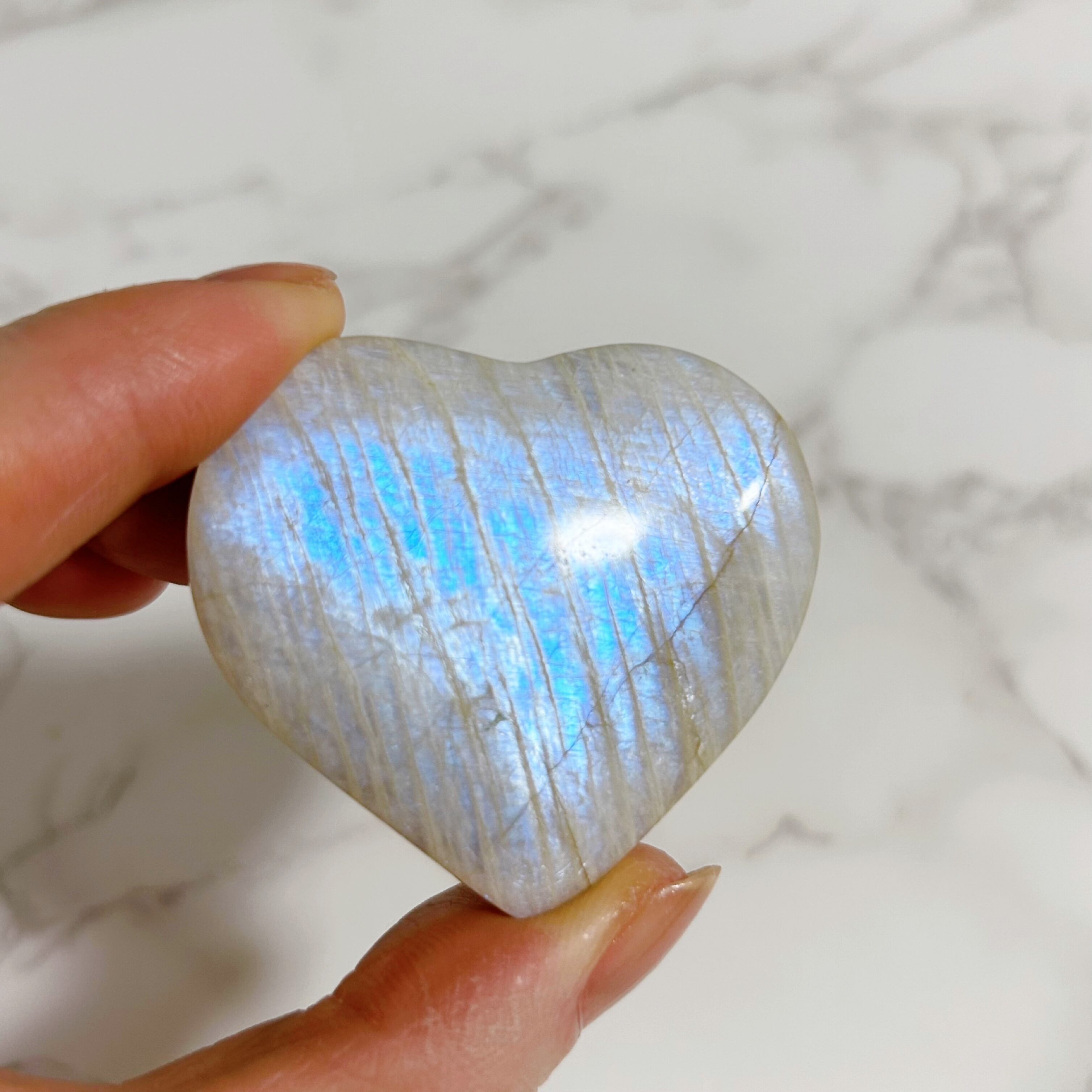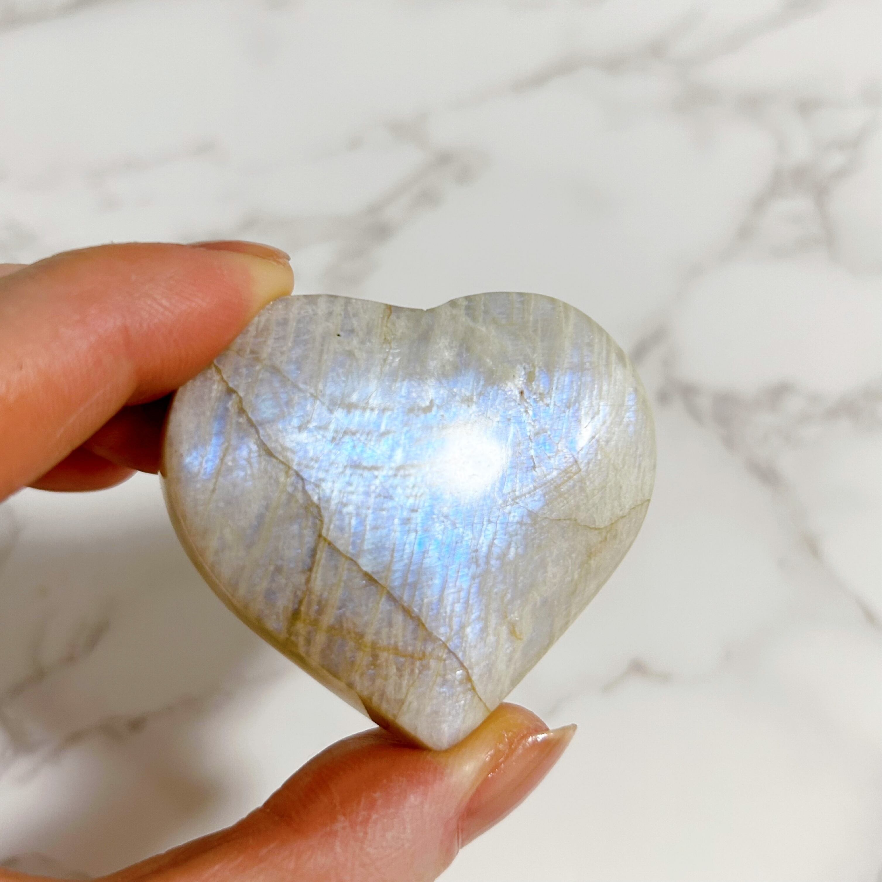 ムーンストーンのハート型パームストーン。淡く優しいブルーのフラッシュがキレイに輝きます。