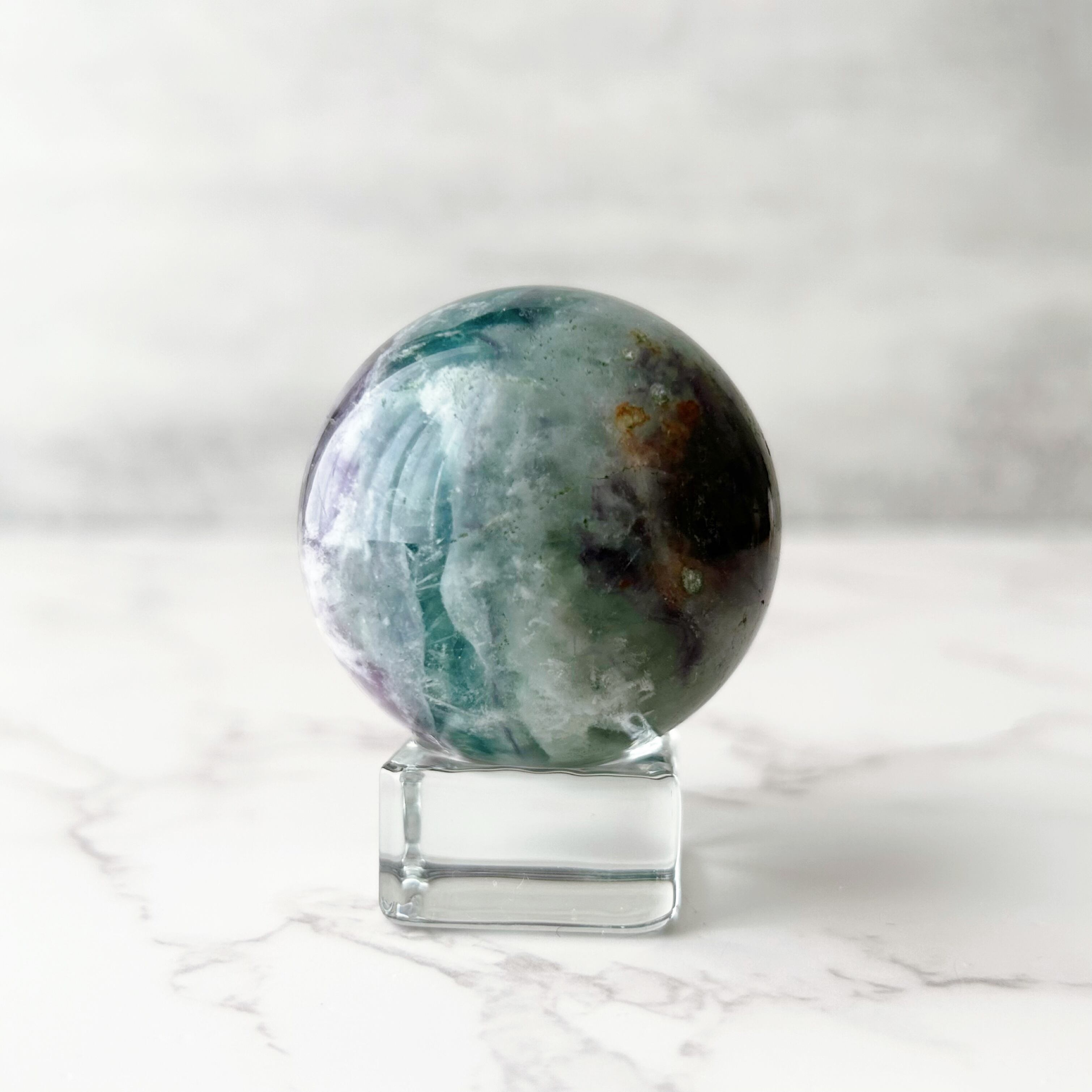濃いめのグリーンとパープルに、エンジェルフェザーが入ったフローライトのスフィアです