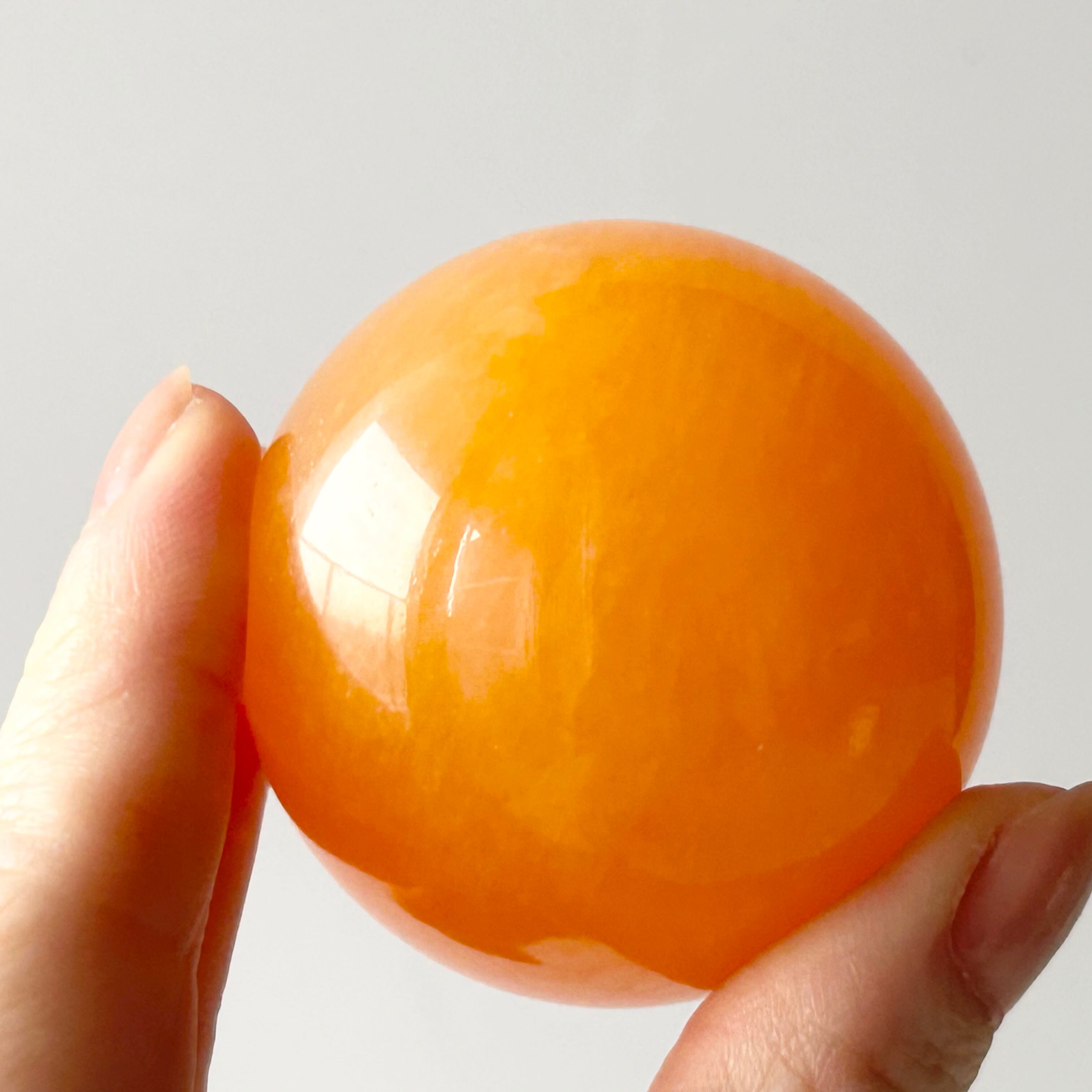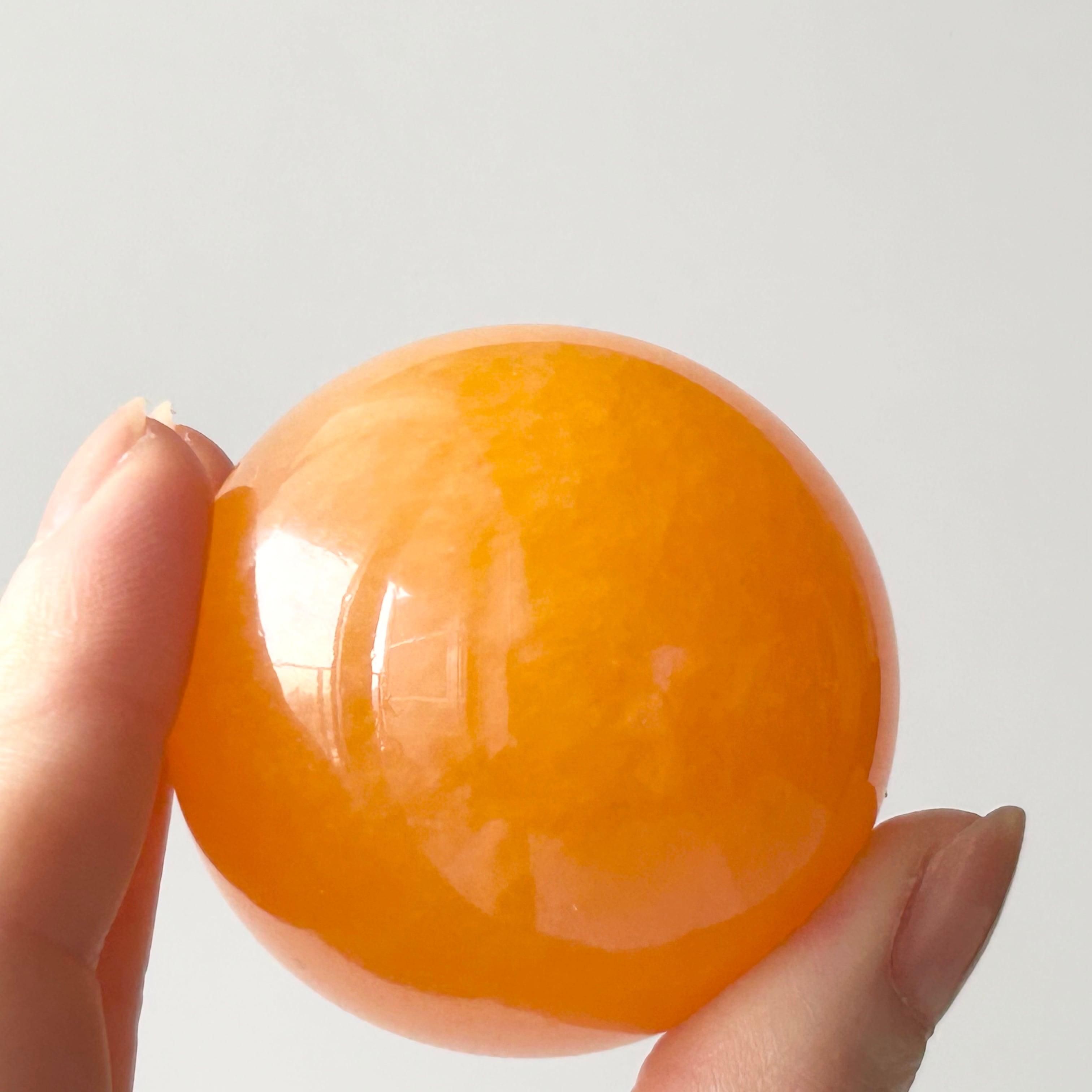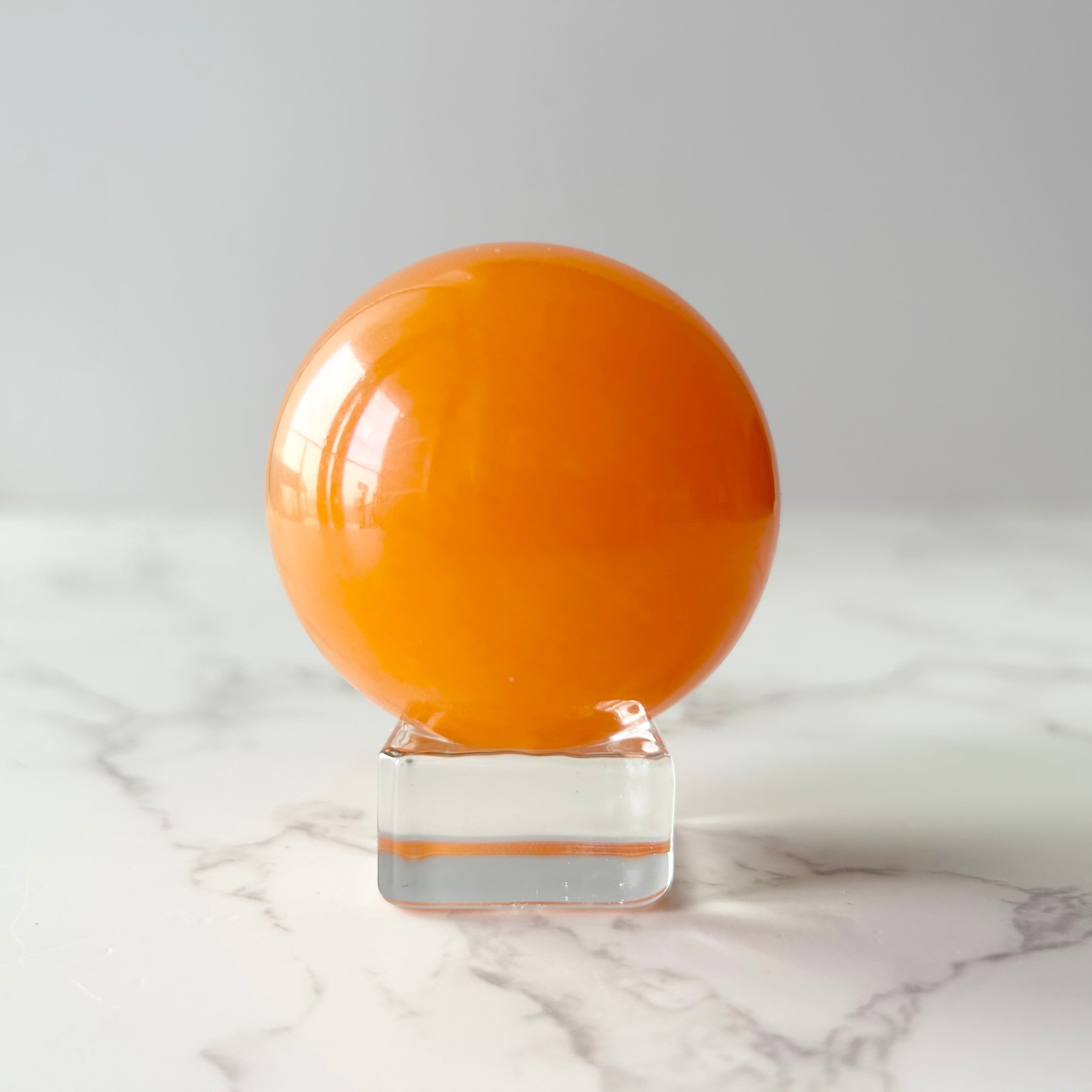 ハイグレードの、メキシコ産オレンジカルサイト・スフィアです。白い部分がなく、濃くジューシーなオレンジ色がキレイです。