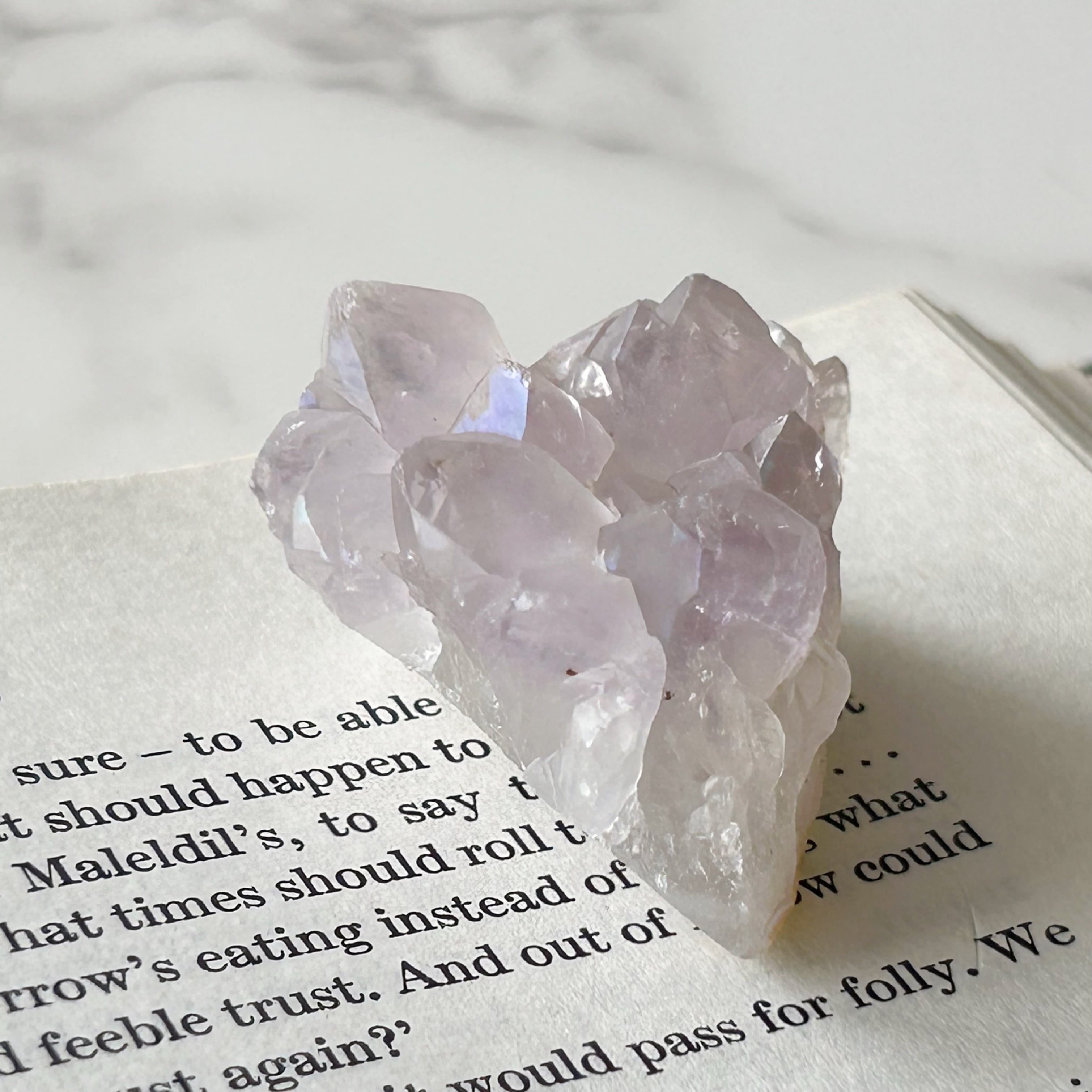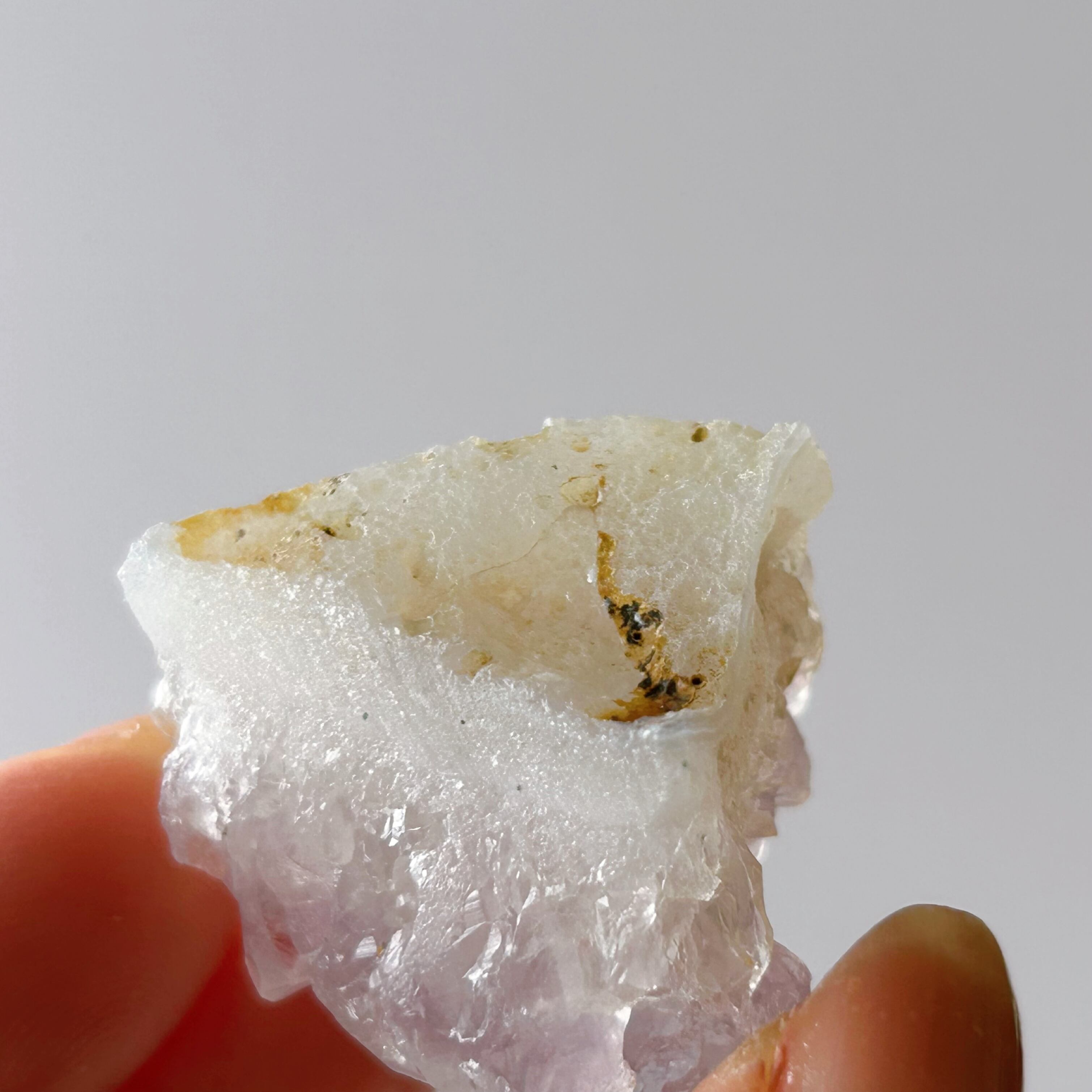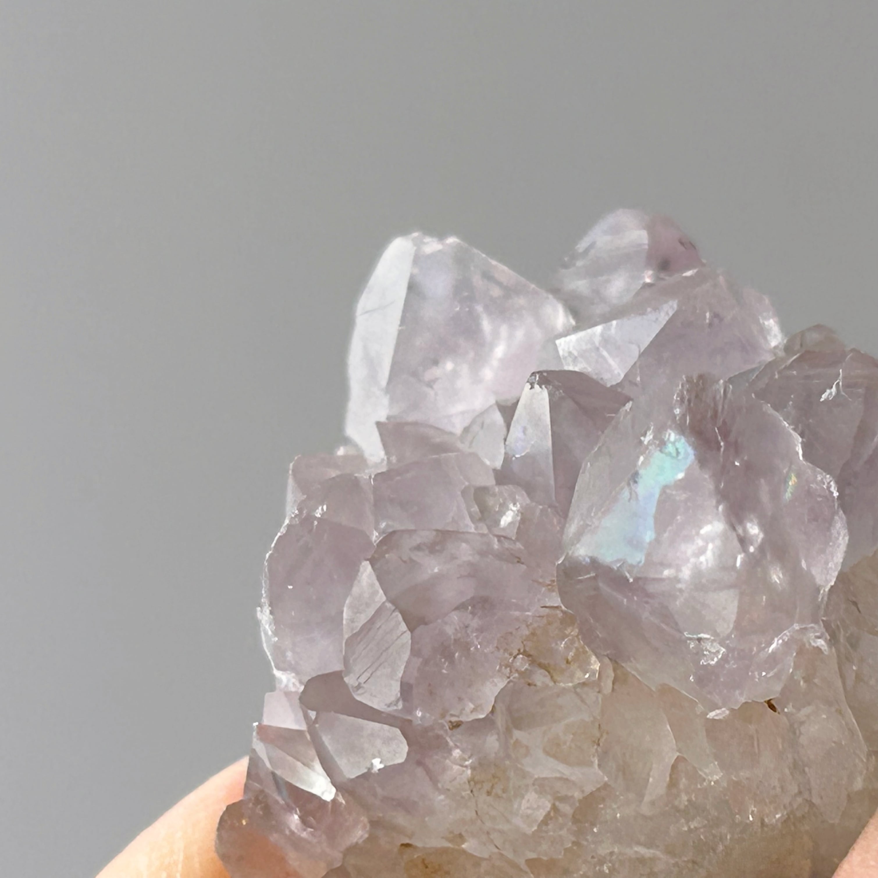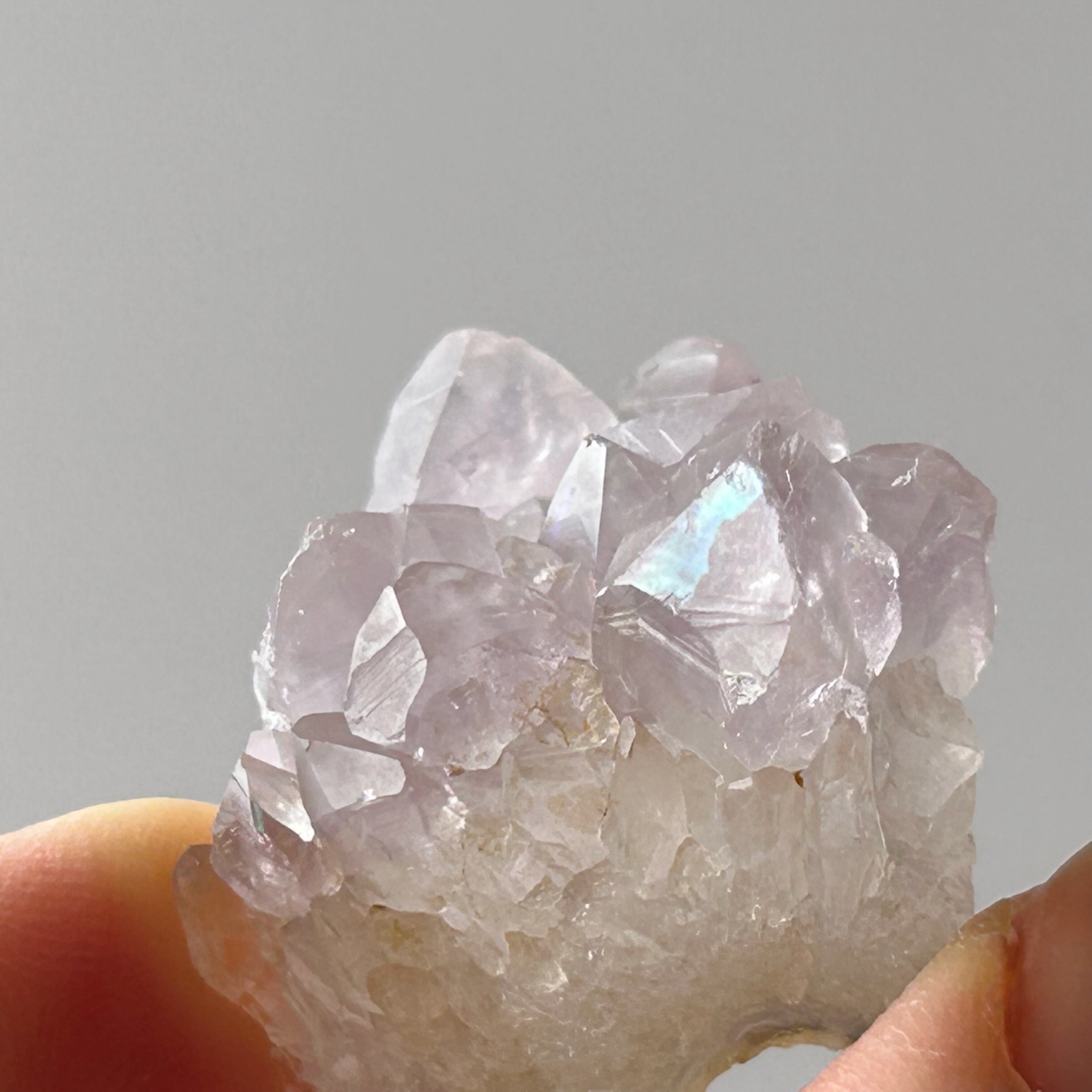 淡く優しいラベンダーカラーの結晶に、ブルーを基調としたムーンストーンのような天然レインボーの輝きが見られます。母岩にはアゲートが共生しています。