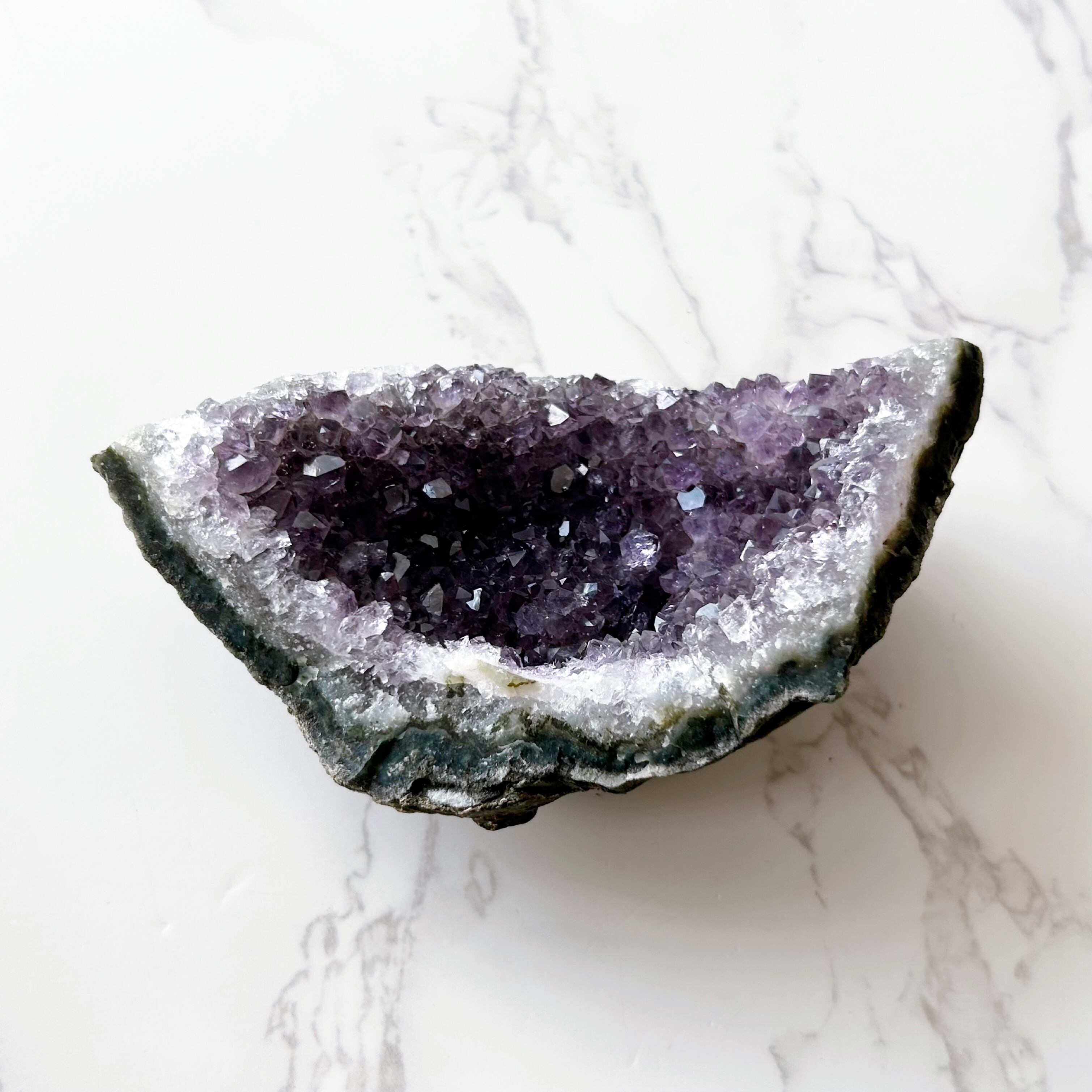 ウルグアイ産アメジストクラスター。深いパープルカラーの結晶がキラキラ輝きキレイです。小さなカルサイトが共生しています。小さめのアクセサリー等を休ませることもできるトレイのような形です。