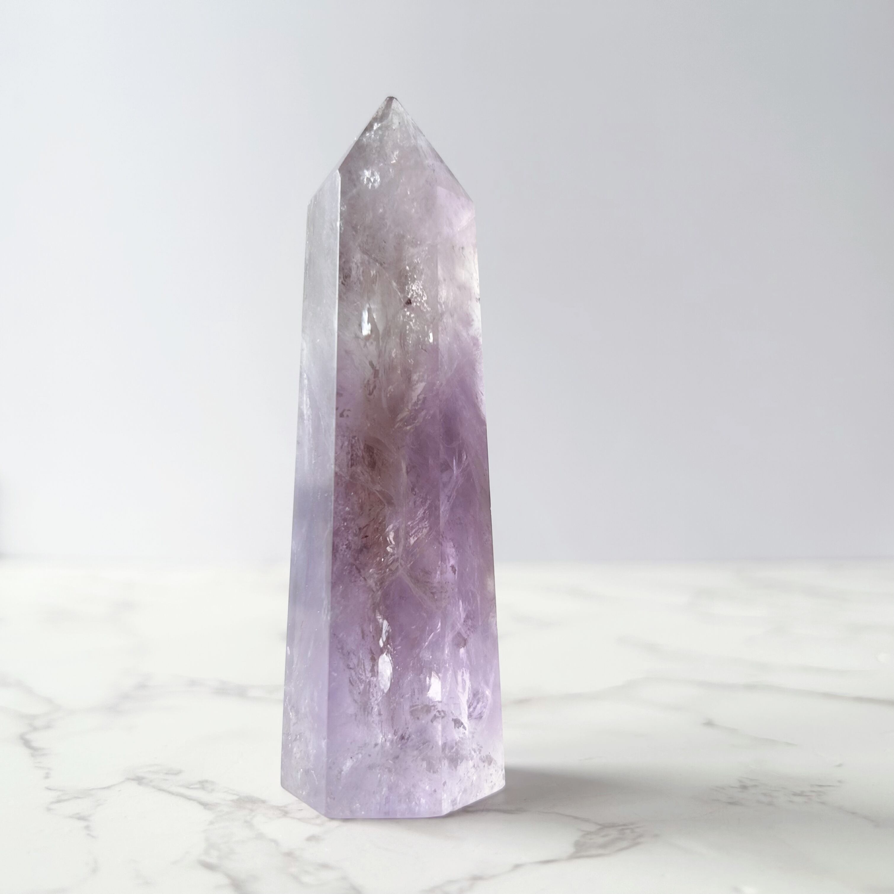 非加熱のナチュラルシトリンのダークカラーと、淡いパープルのアメジストが混ざり合い、とてもキレイなアメトリンのタワー。レインボーも見られます。