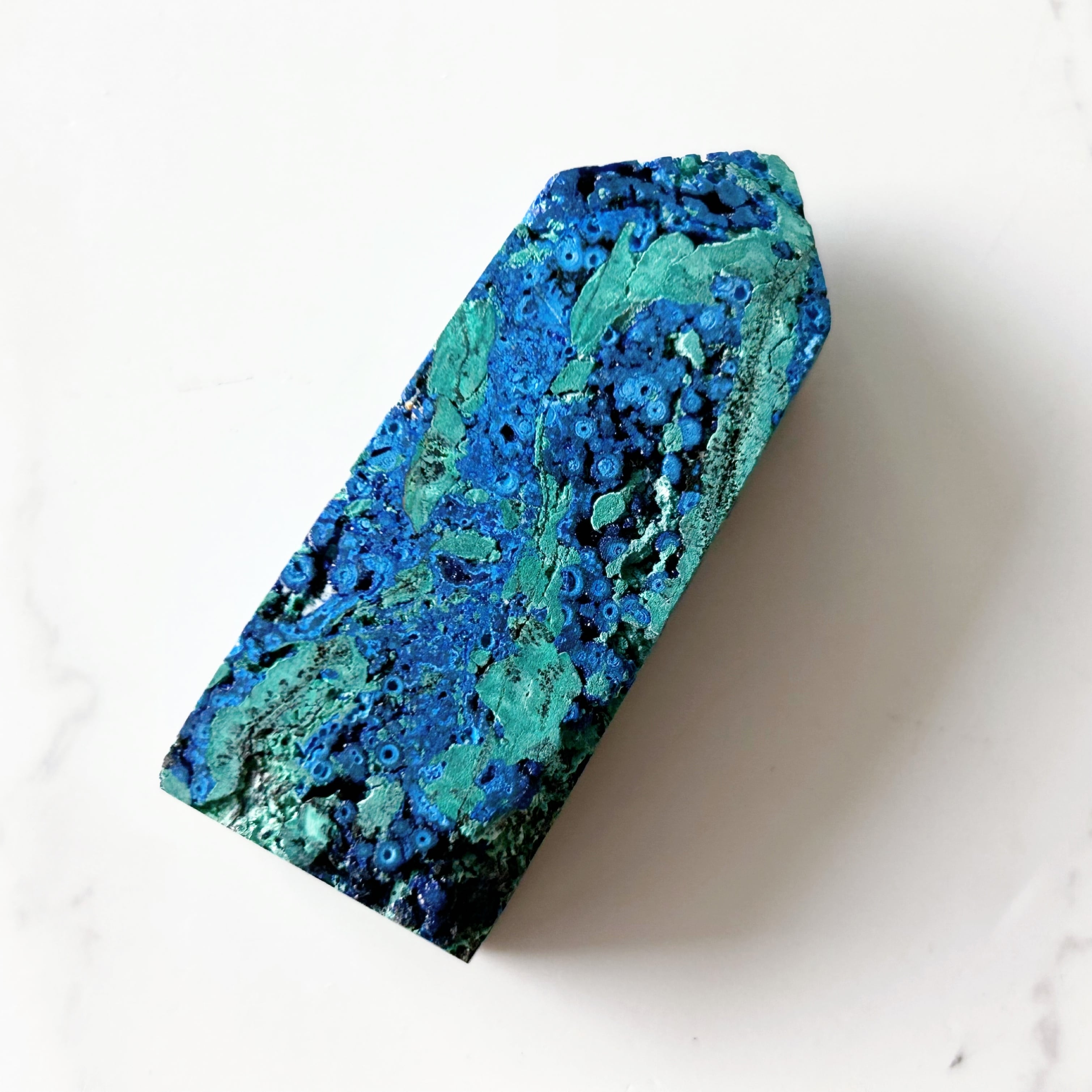 鮮やかなブルーとグリーンが美しいアズライトクリソコラのタワーです。