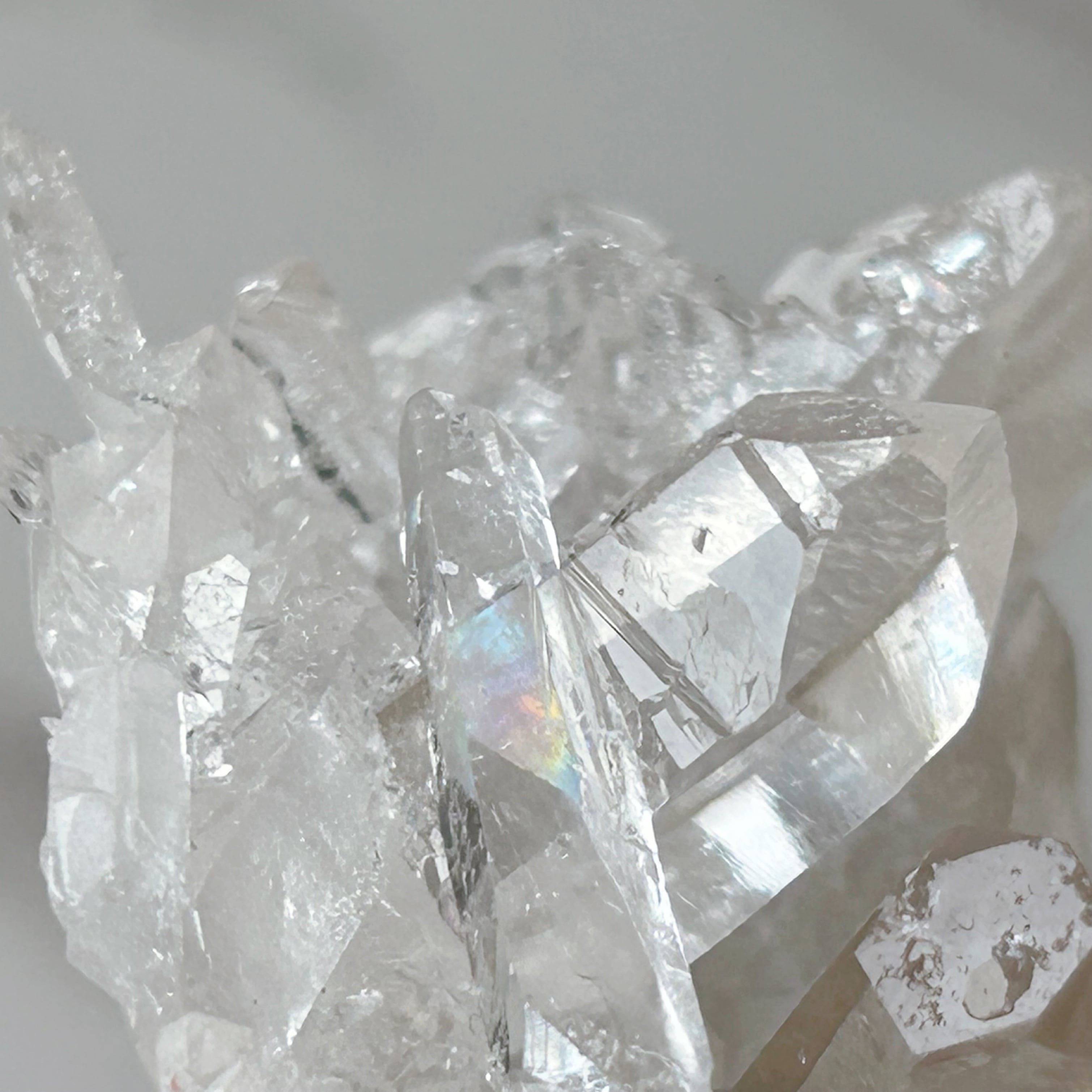 大変美しいゼッカデソウザ産の水晶クラスターです。柱面にレコードキーパーのような模様が見られ、神秘的です。あちこちにレインボーも見られます。