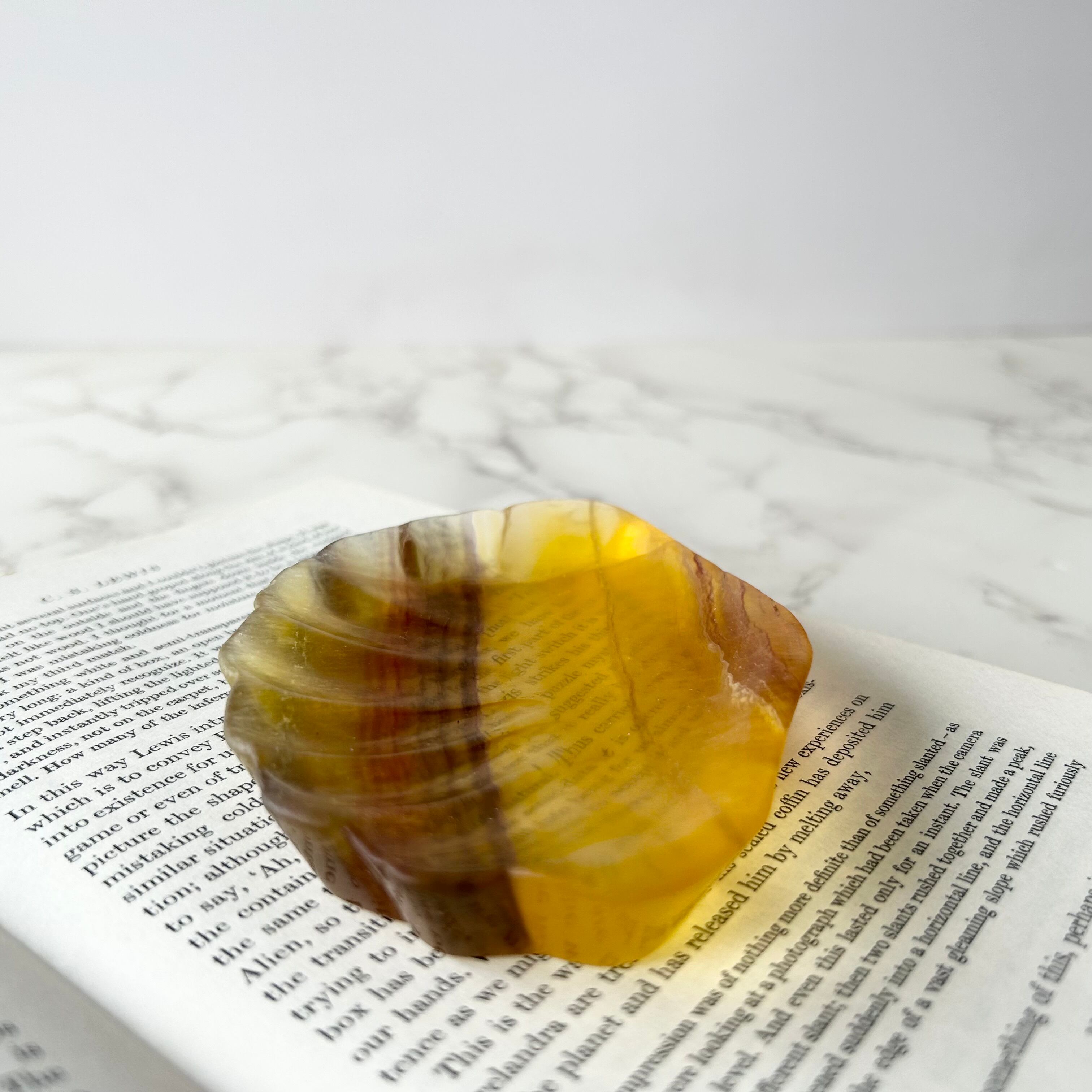 イエローフローライトのシェル型トレイ。パープルのラインがキレイです。