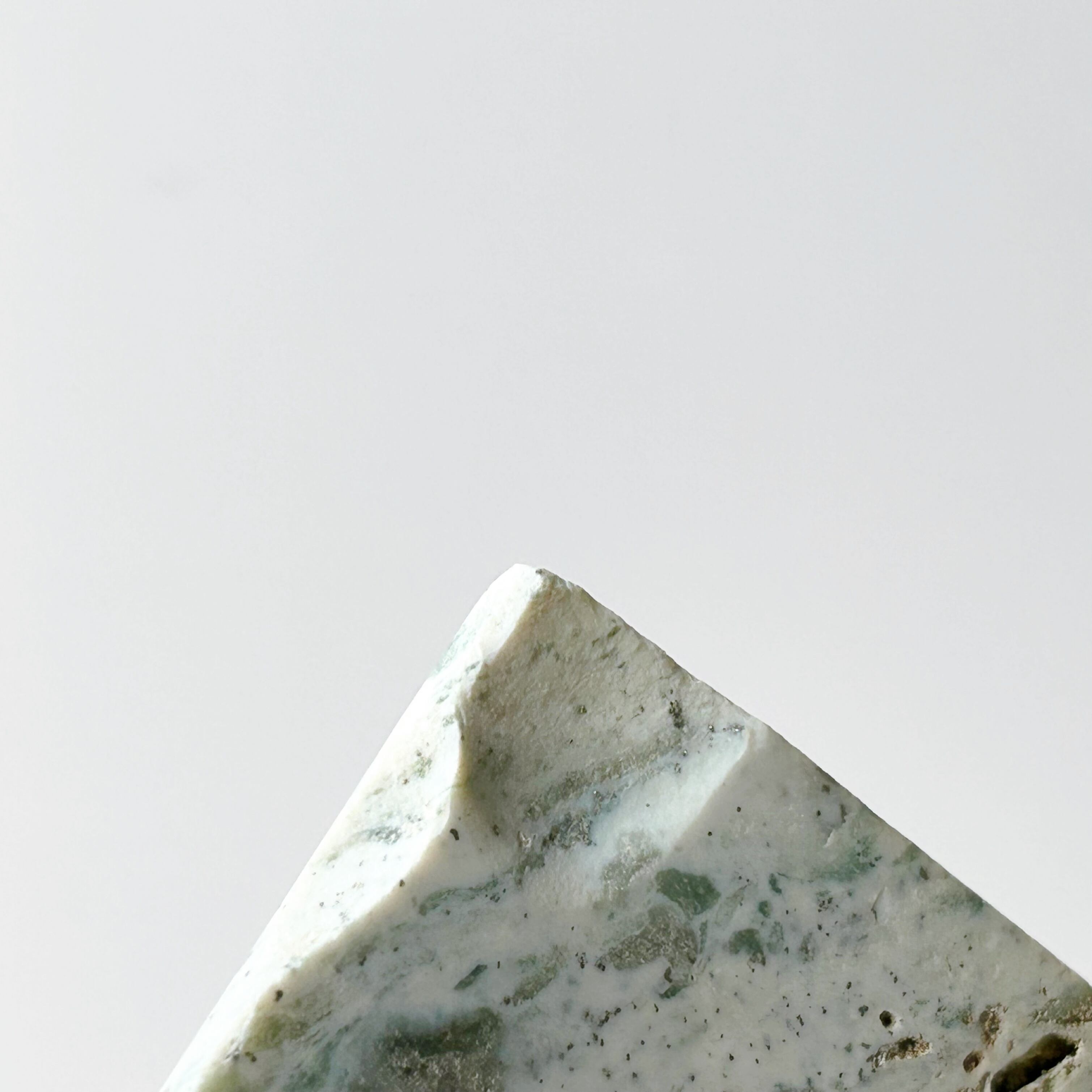 淡いブルー、ホワイト、グレーの色合いが美しいオーシャンジャスパーのピラミッドです。底面に欠けがあるため、アウトレット価格でのご提供です。