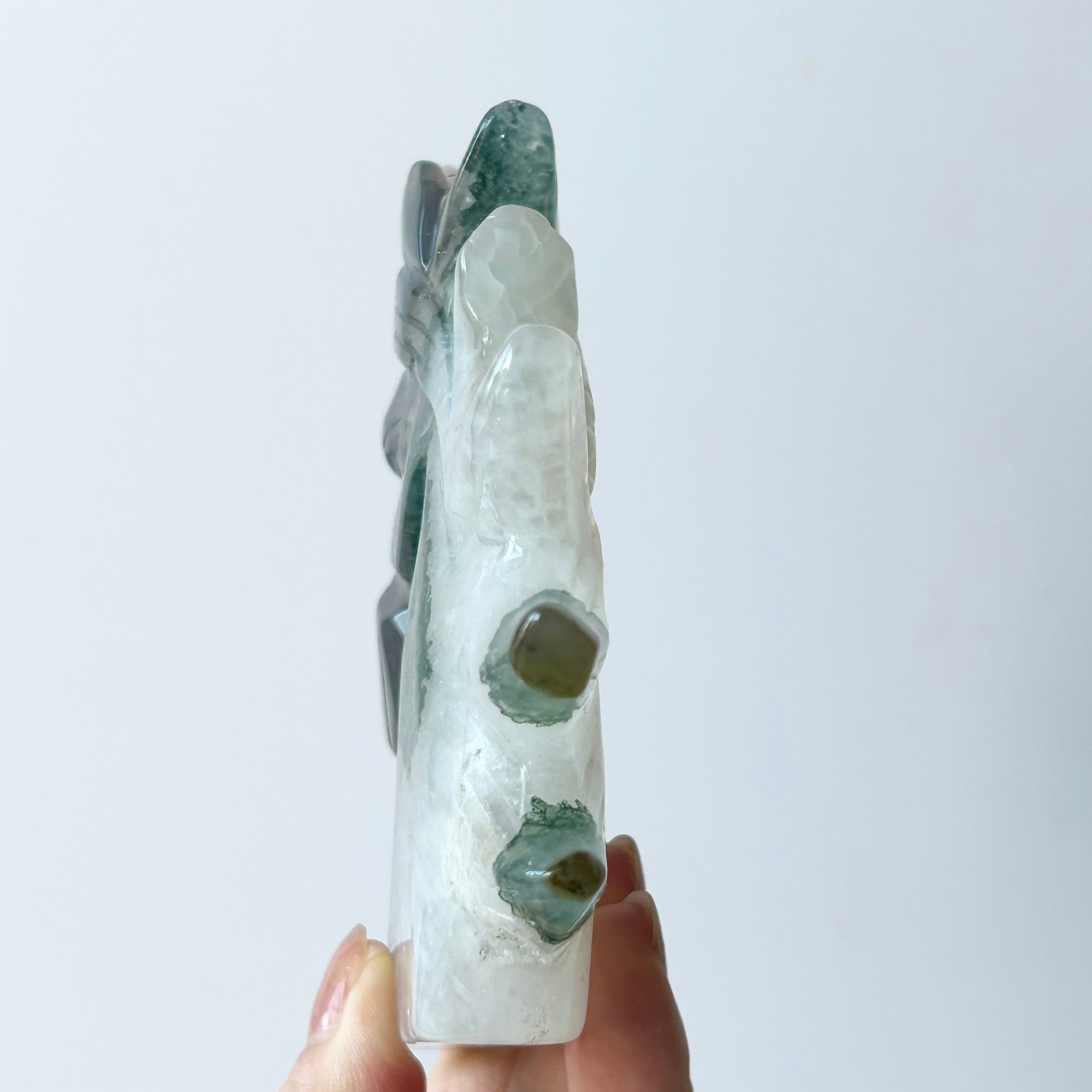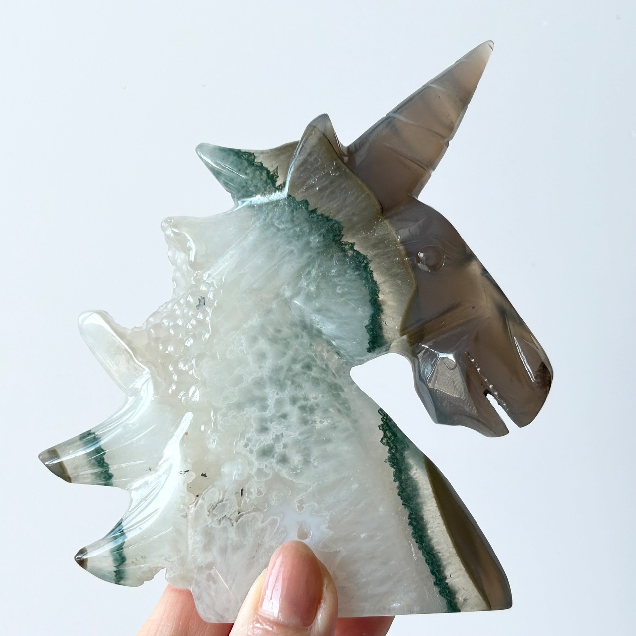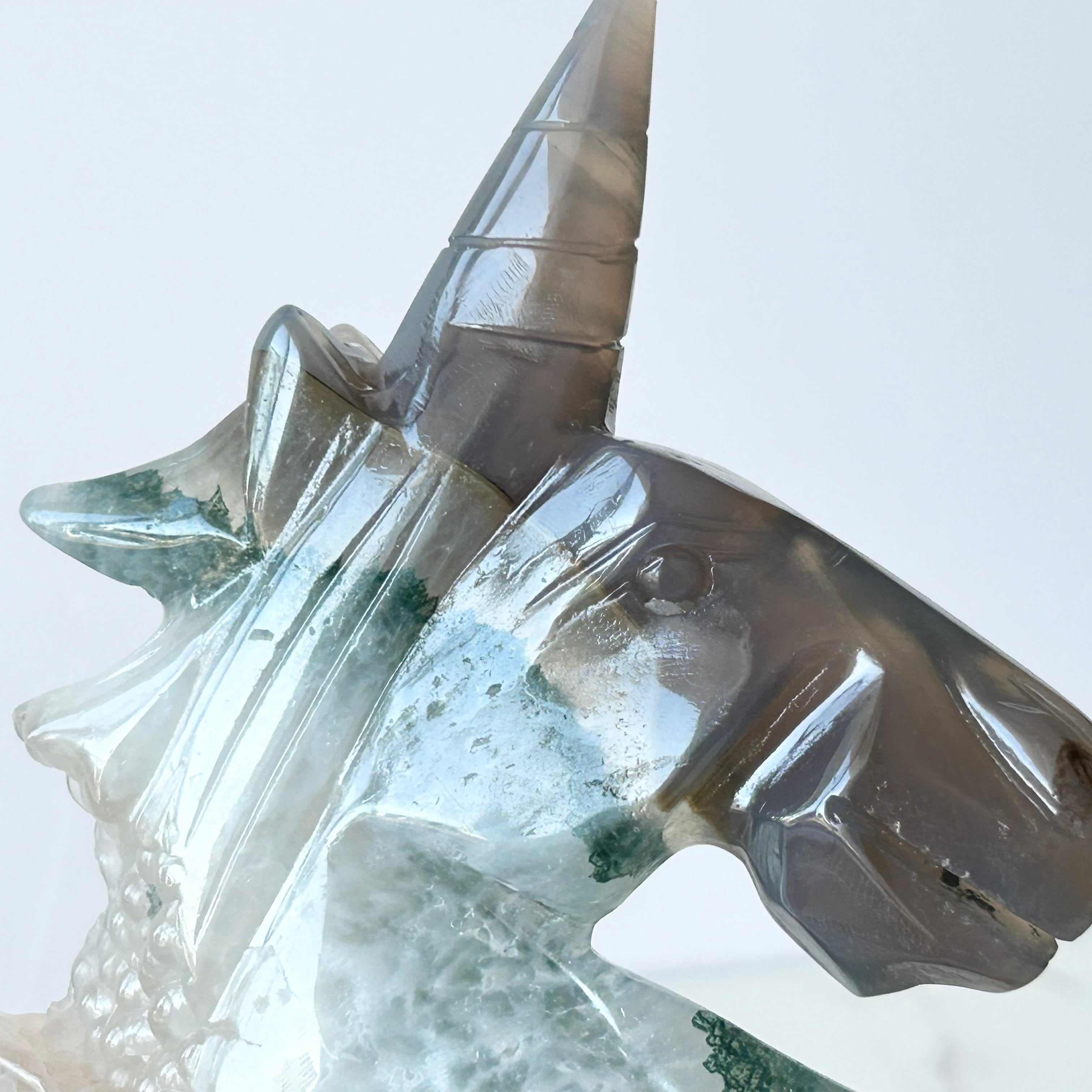 モスアゲートのユニコーン、ビッグサイズです。グレージュのお顔に真ん丸の目が可愛いらしく、透明感のあるホワイトの体にグリーンの模様が入り、とても素敵です。美しい佇まいと凛々しさとが共存し、お顔はとても優しいです。