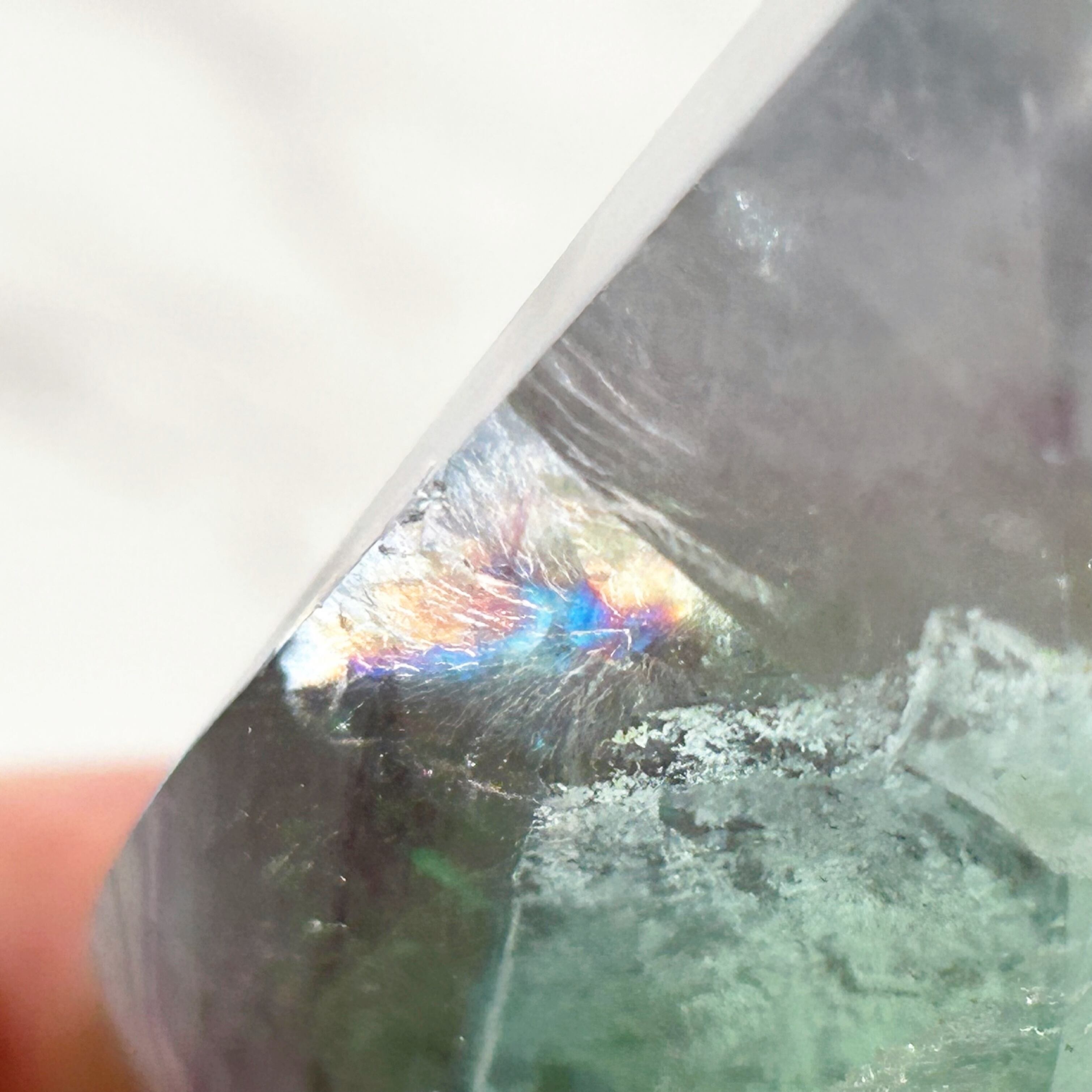 スリムでスタイリッシュなフローライトのフレイムシェイプ。透明感のある爽やかなグリーンとパープルに、あちこちに見られるレインボーが華を添え、とても素敵です。