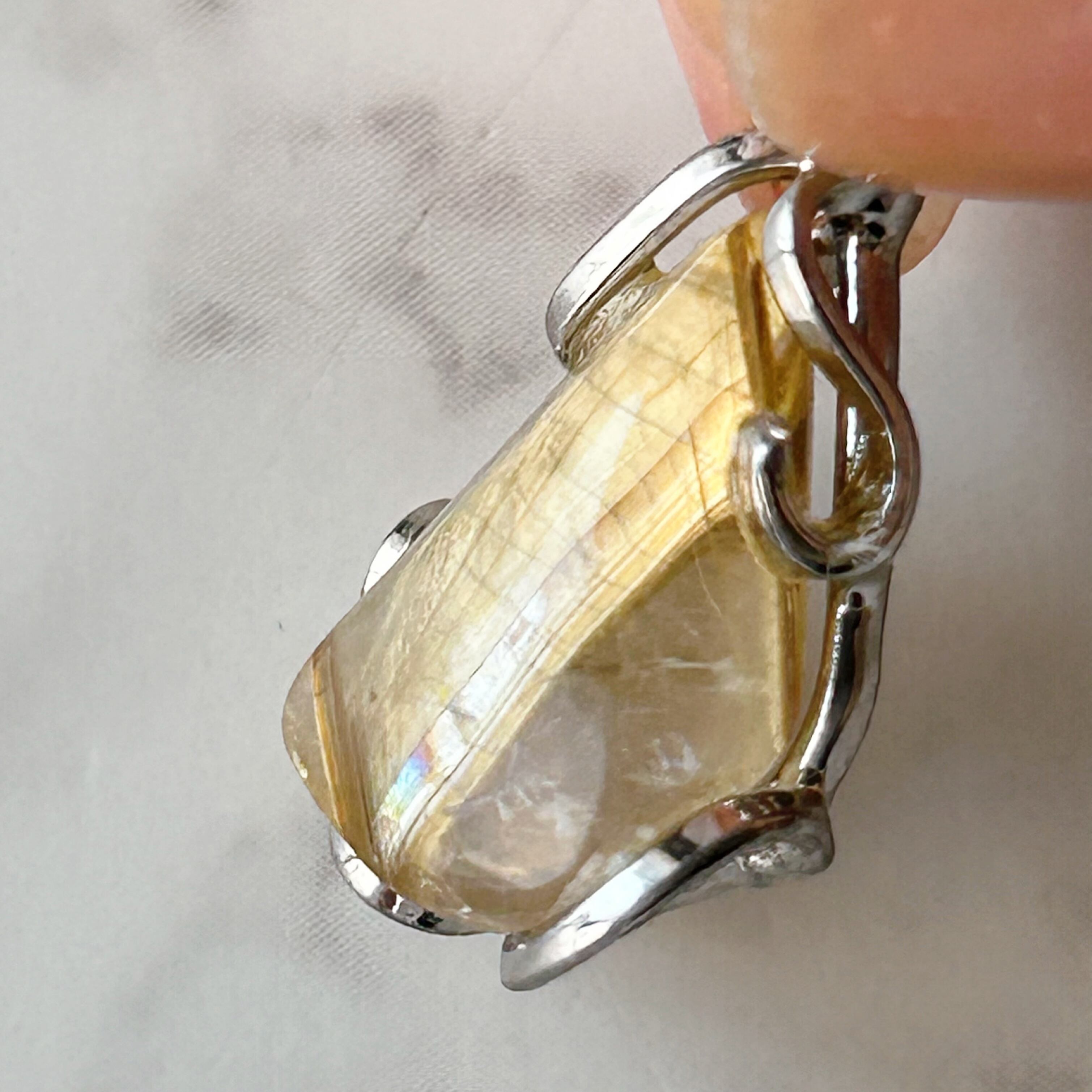 ルチルクォーツのネックレスです。太くて輝きのあるゴールドルチルに、レインボーが見られ、とても素敵です。