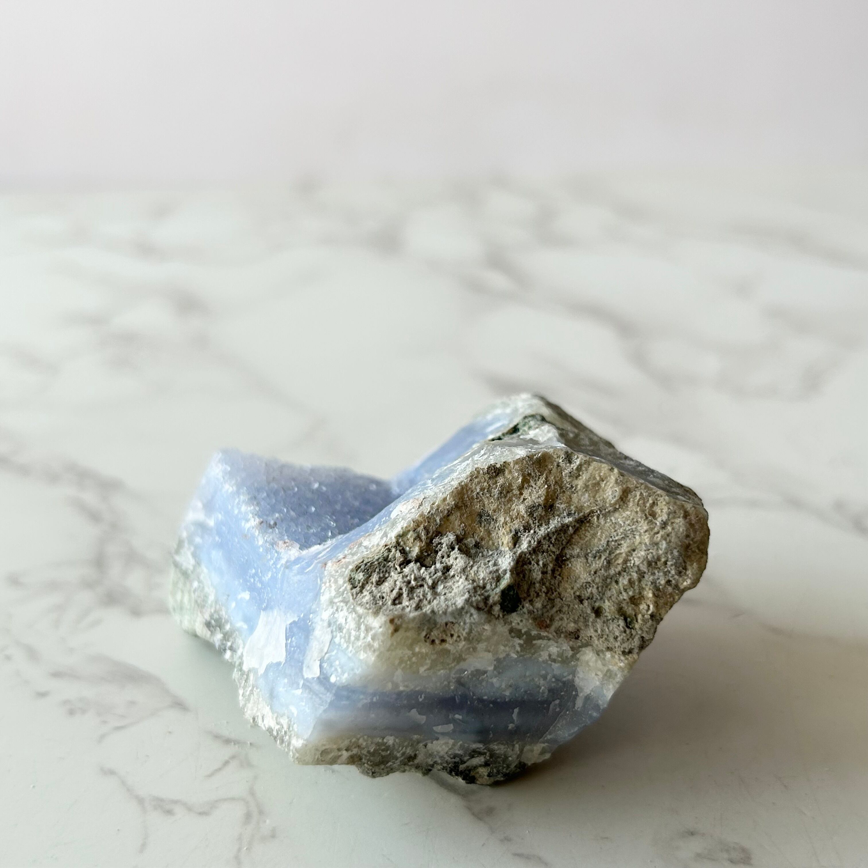 爽やかなブルーと縞模様がキレイなブルーレースアゲートの原石。ドゥルージーも見られ、とてもキレイです。
