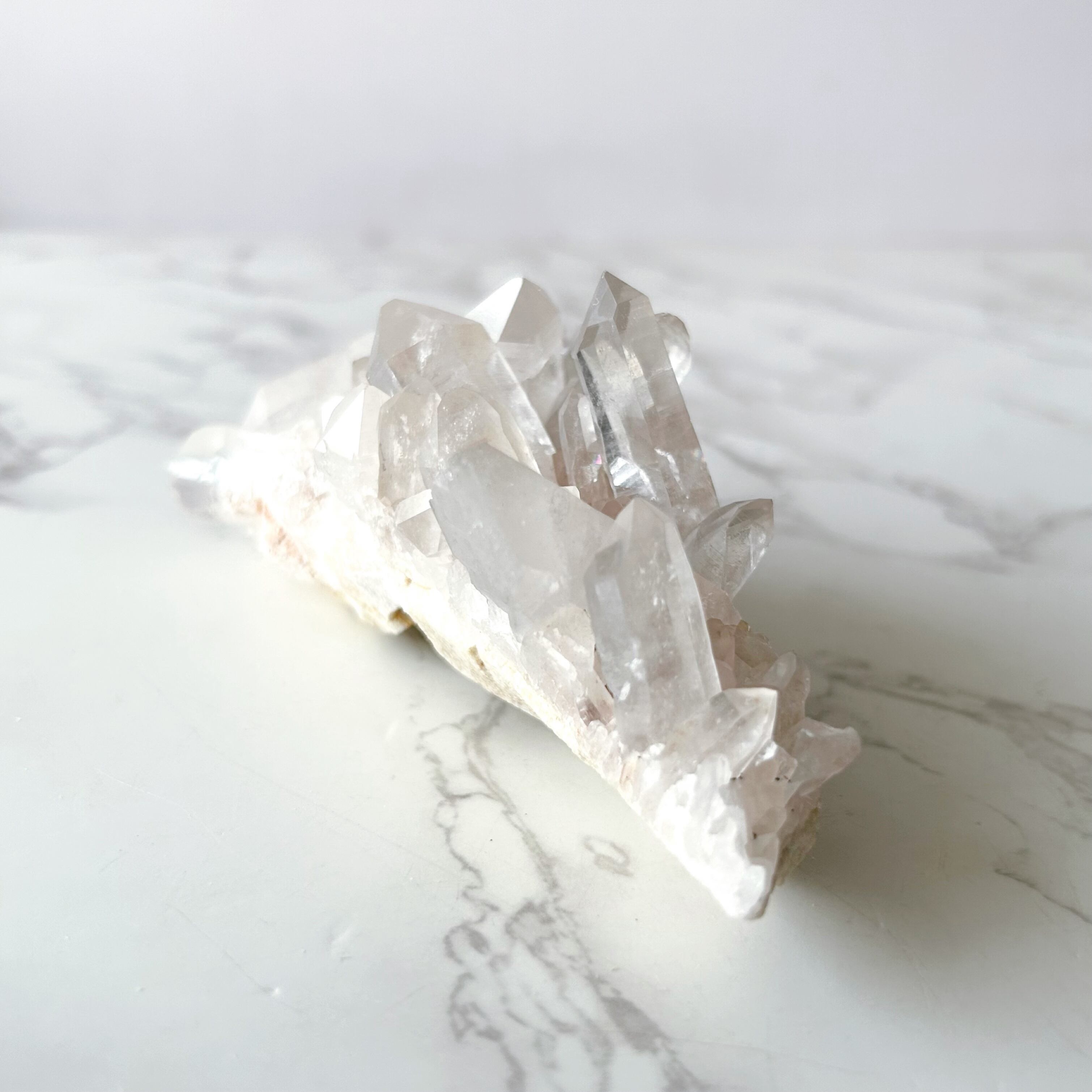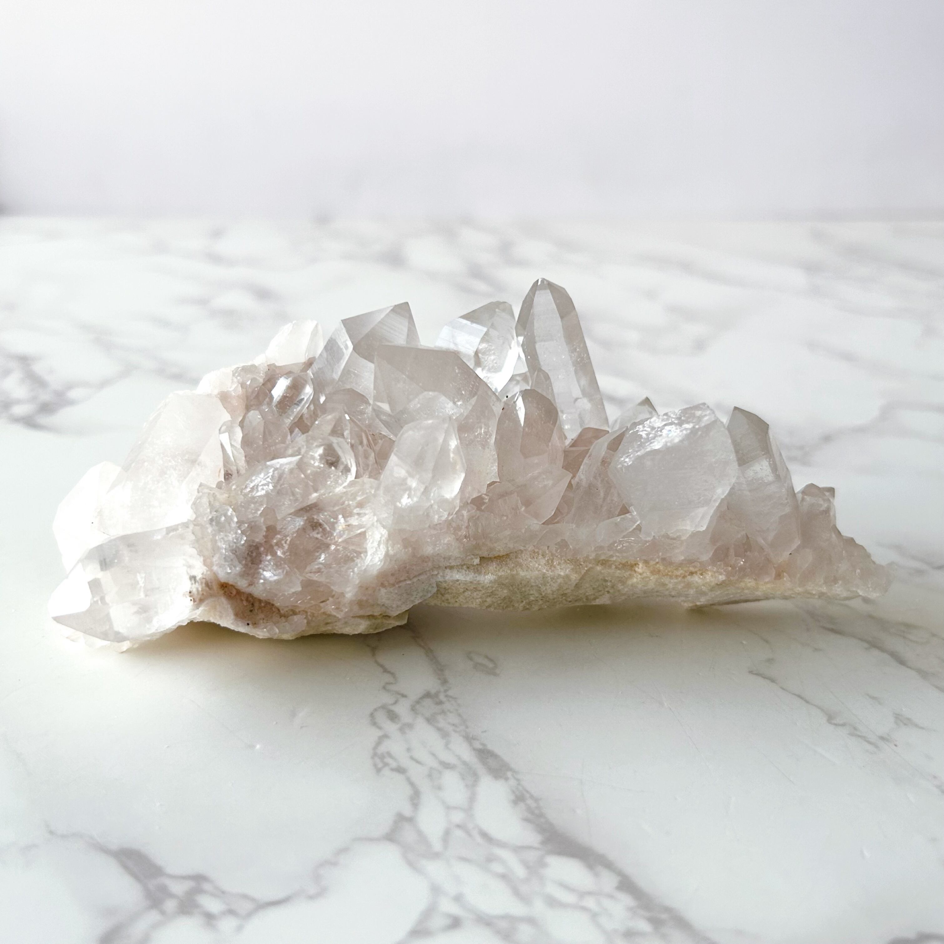 淡いピンク色と透明感が美しい、マニカラン産水晶クラスターです。ブレスレットを休ませるのにも丁度良い大きさです。