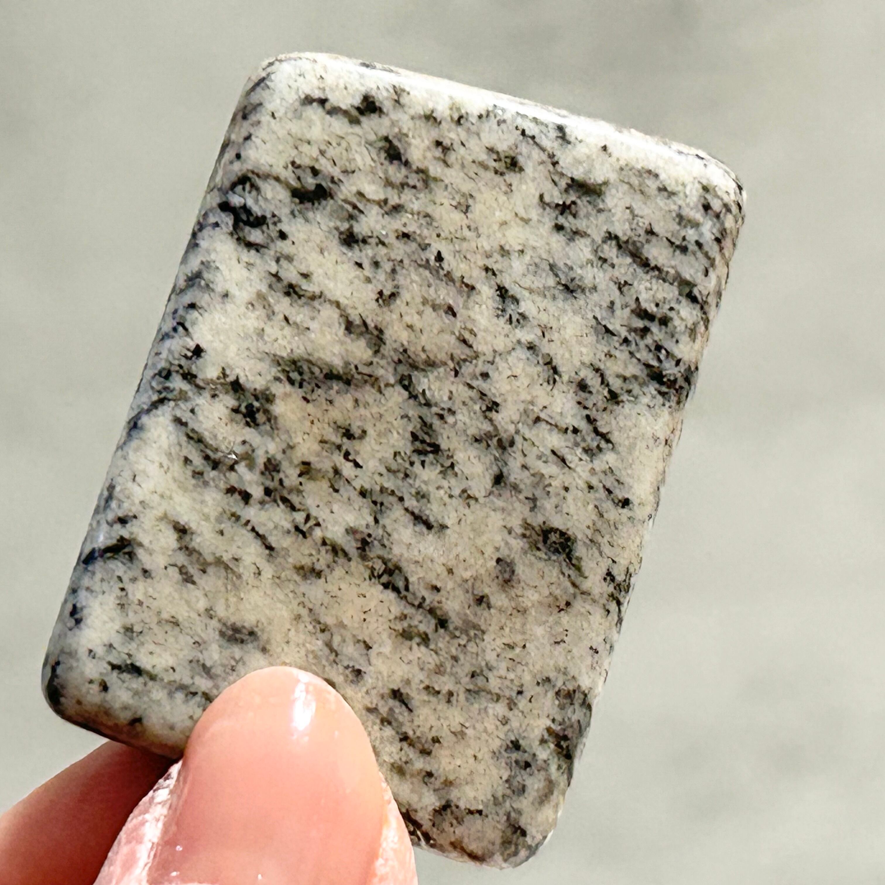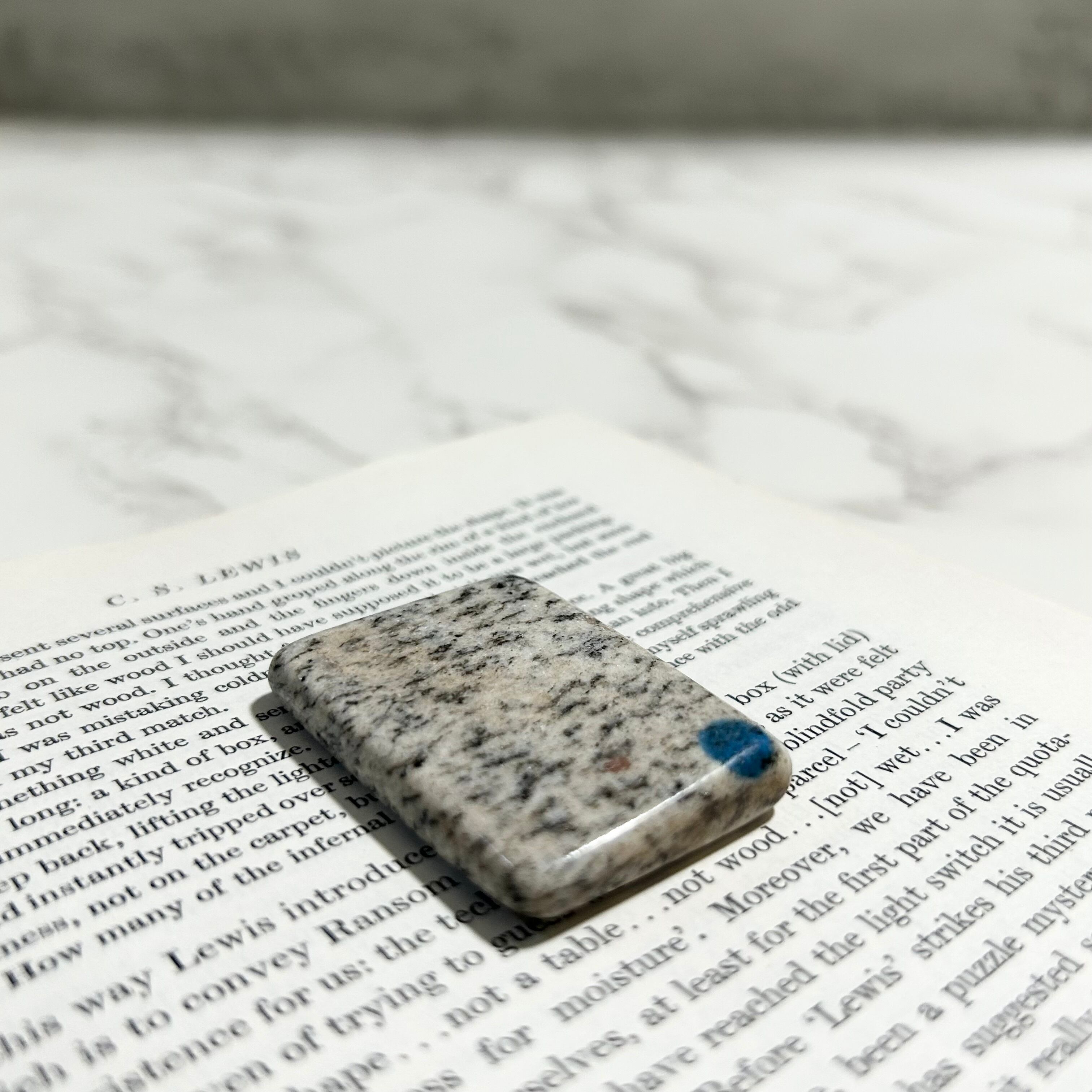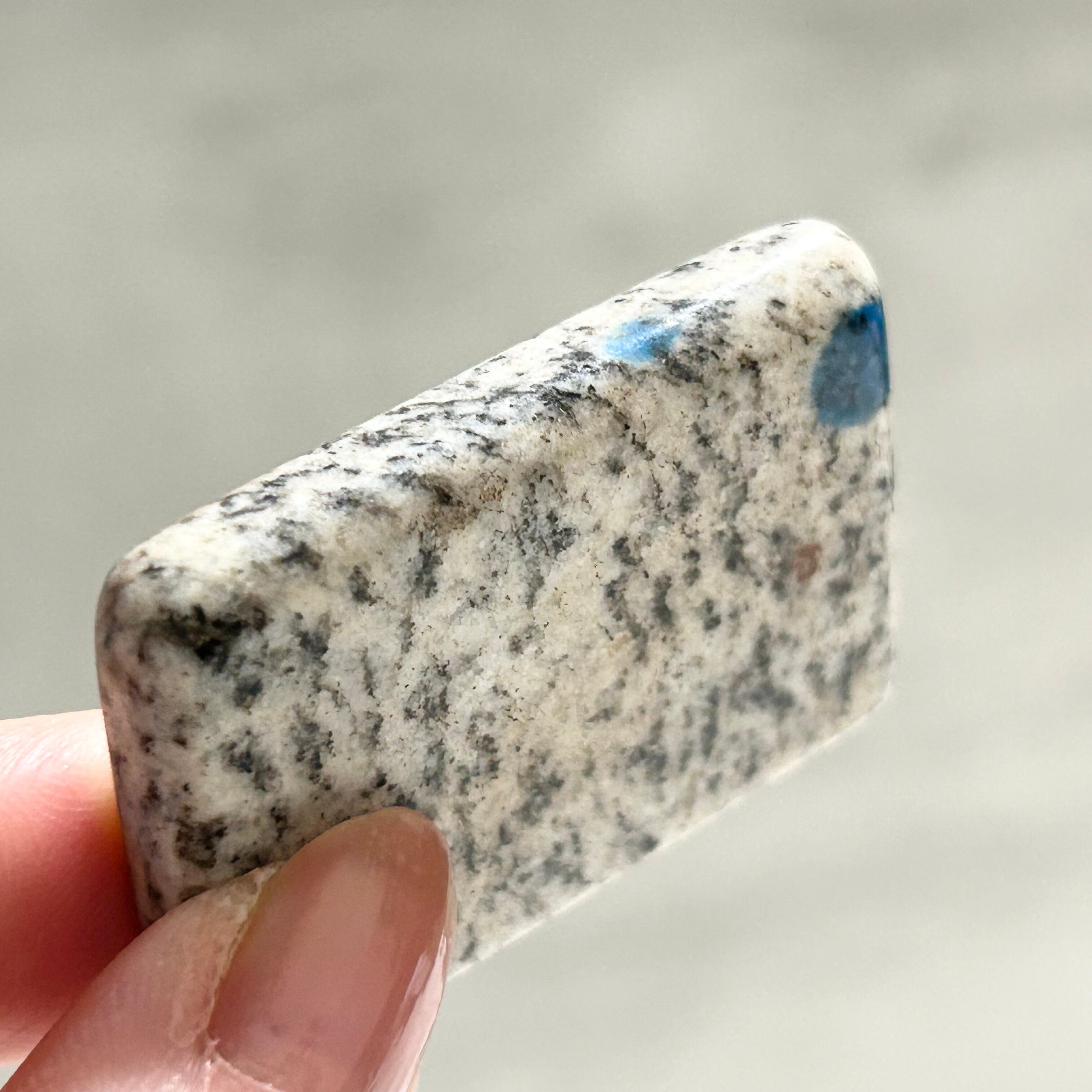 灰色の地色に青色の斑点が特徴的な石で、灰色部分は花崗岩(グラナイト)、青色部分は藍銅鉱(アズライト)で構成されています。