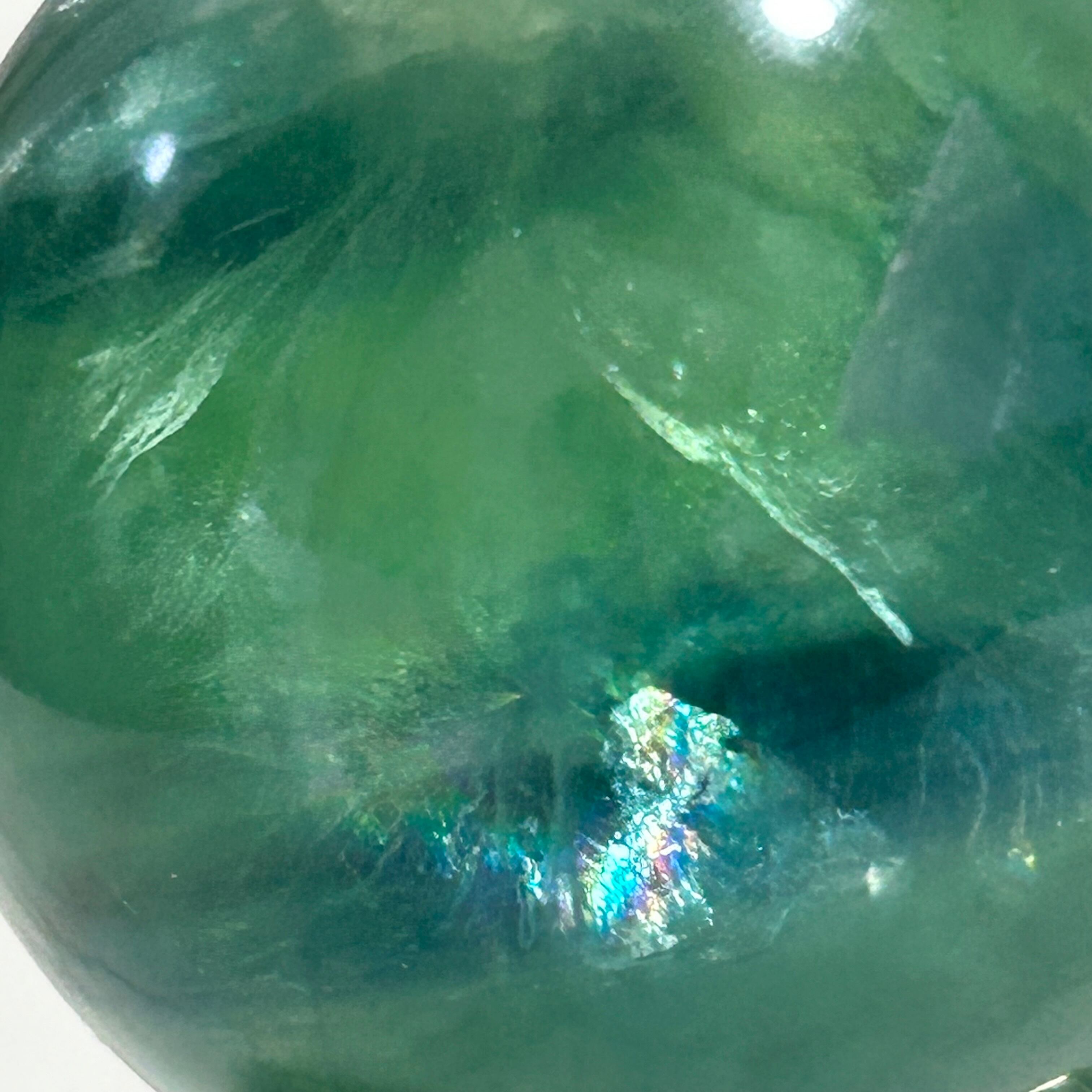 透明感の高い爽やかなグリーンがキレイな、エンジェルフェザーフローライトのスフィアです。内部に大きなレインボーが見られます。