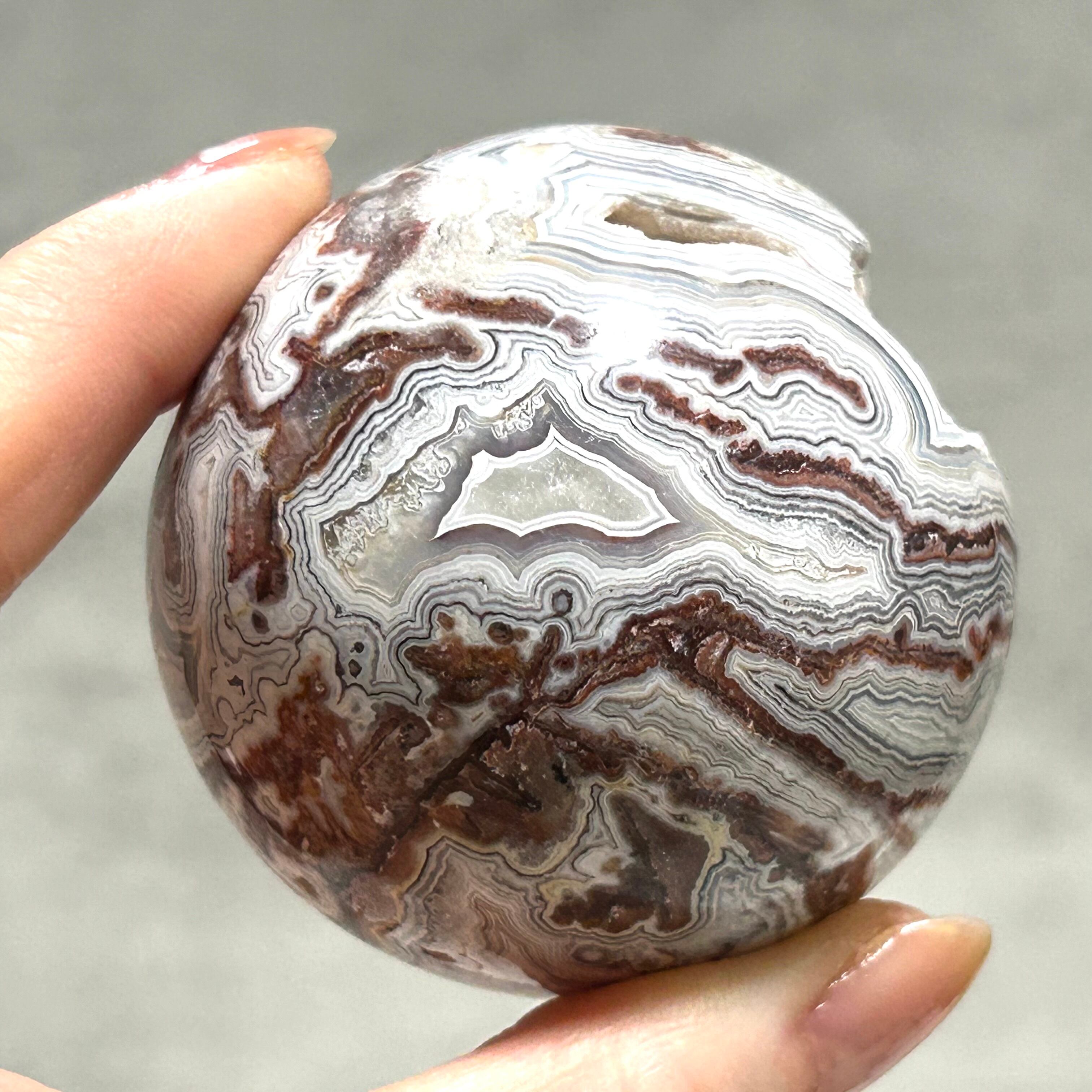 メキシカンクレイジーレースアゲートのスフィアです。ホワイトベースに、ライトグレーとレッドブラウンの縞模様がキレイです。ポケットから覗くドゥルージーがキラキラ輝きます。