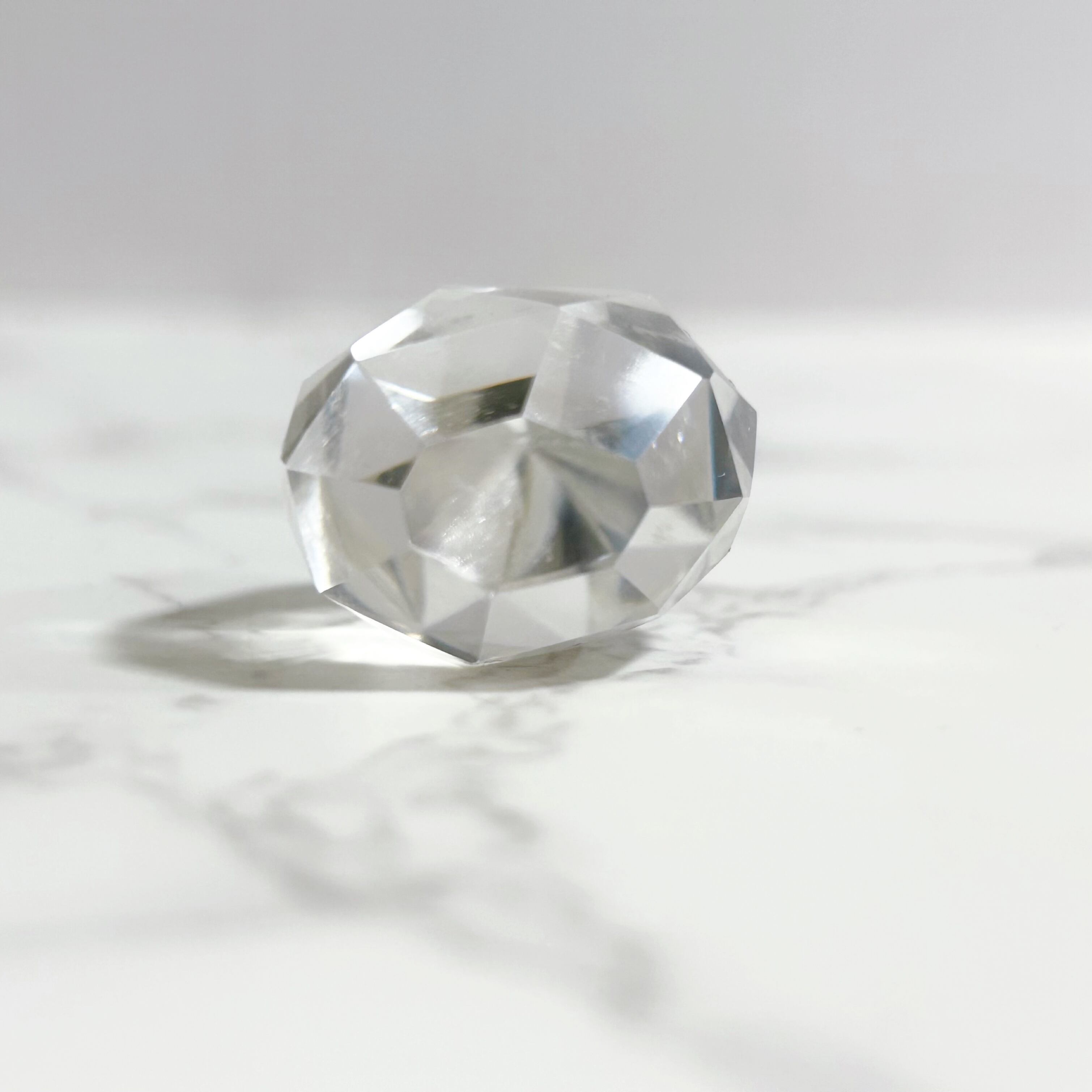 クリアクォーツのファセットカットです。クラックのないハイクオリティの水晶をドロップ型の多面体にカットしてあるので、光があちこちに反射し、どこから見ても美しく輝きます。