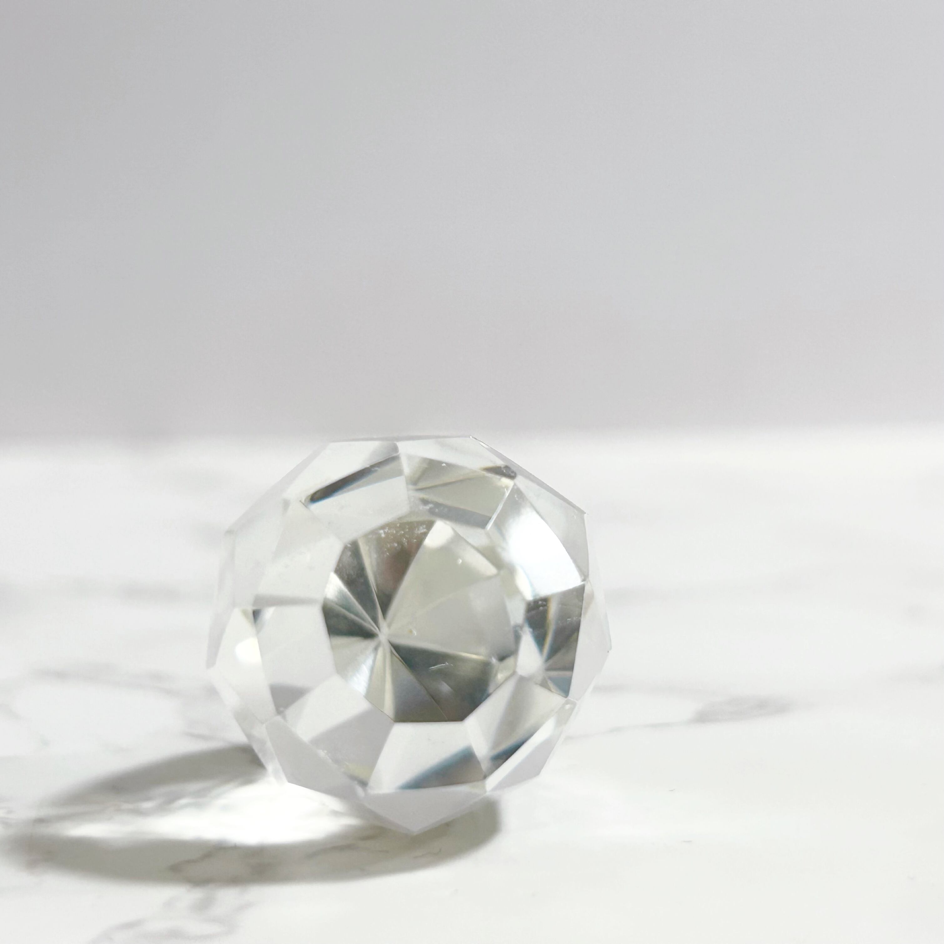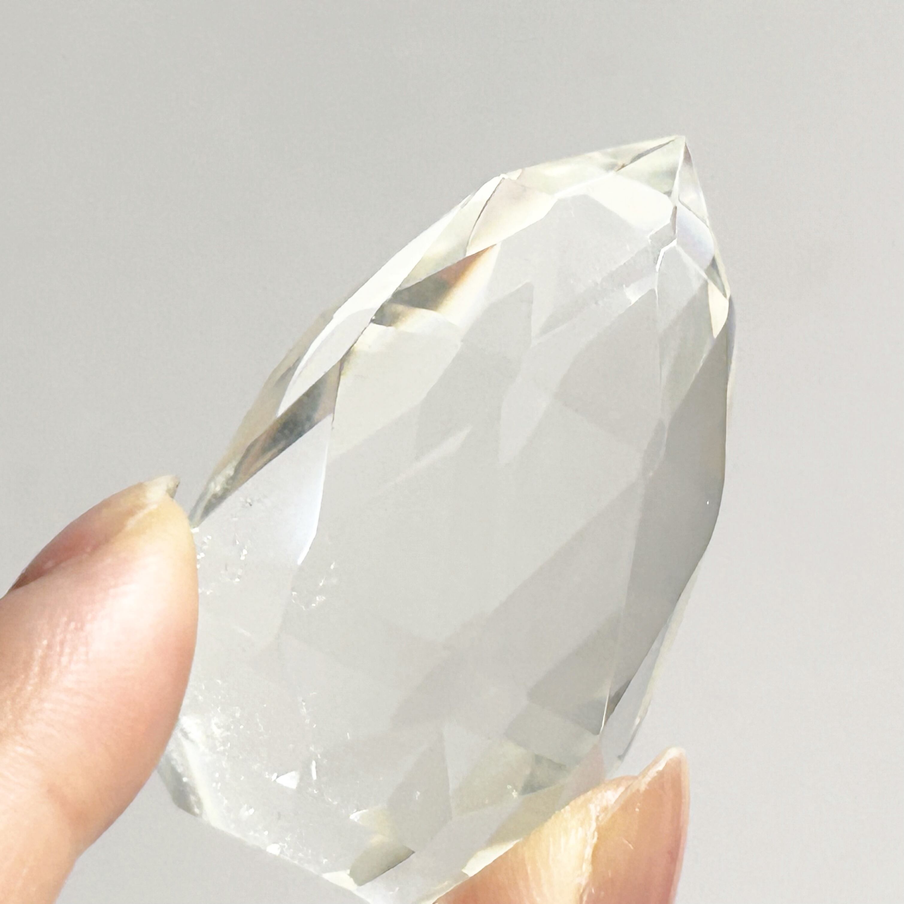 クリアクォーツのファセットカットです。クラックのないハイクオリティの水晶をドロップ型の多面体にカットしてあるので、光があちこちに反射し、どこから見ても美しく輝きます。