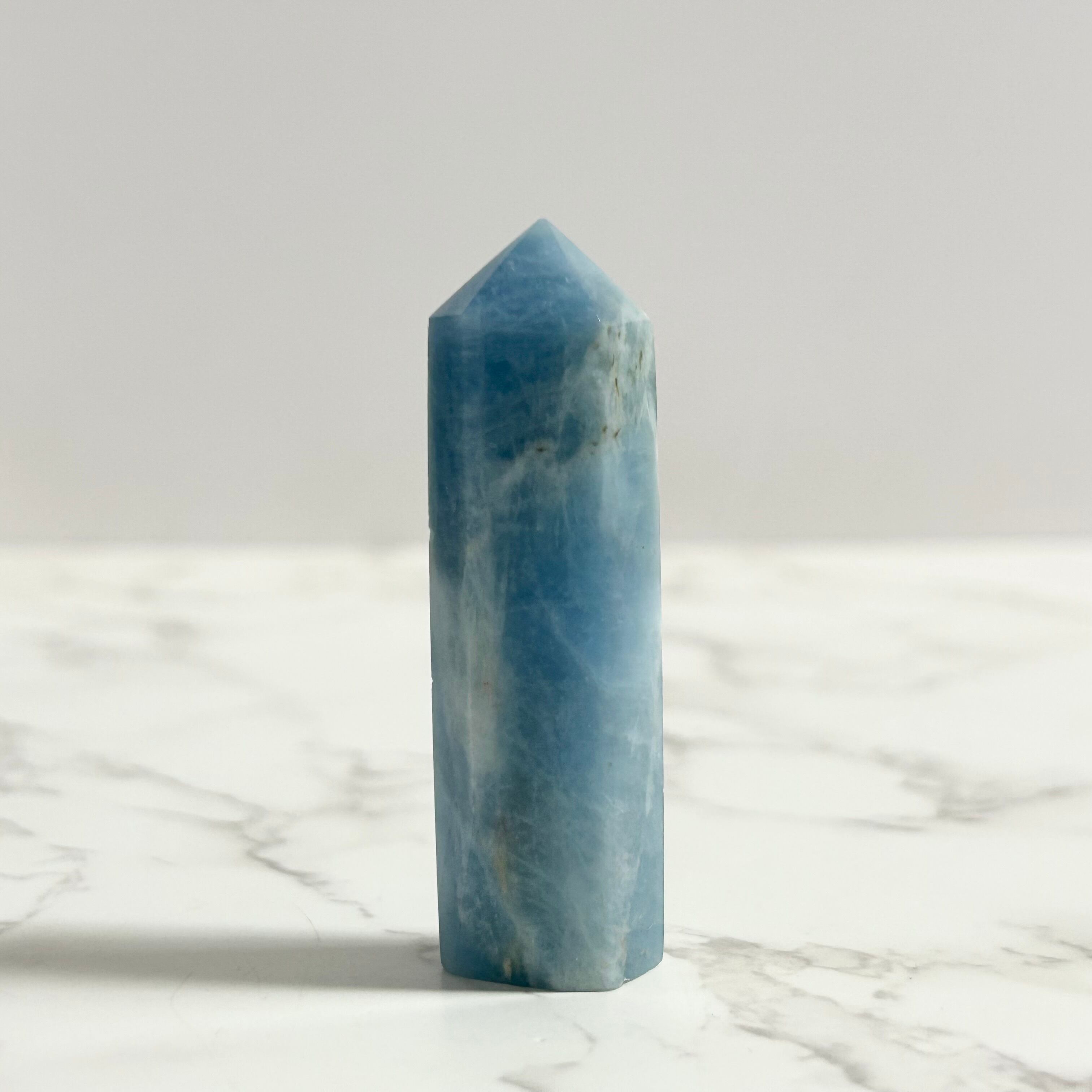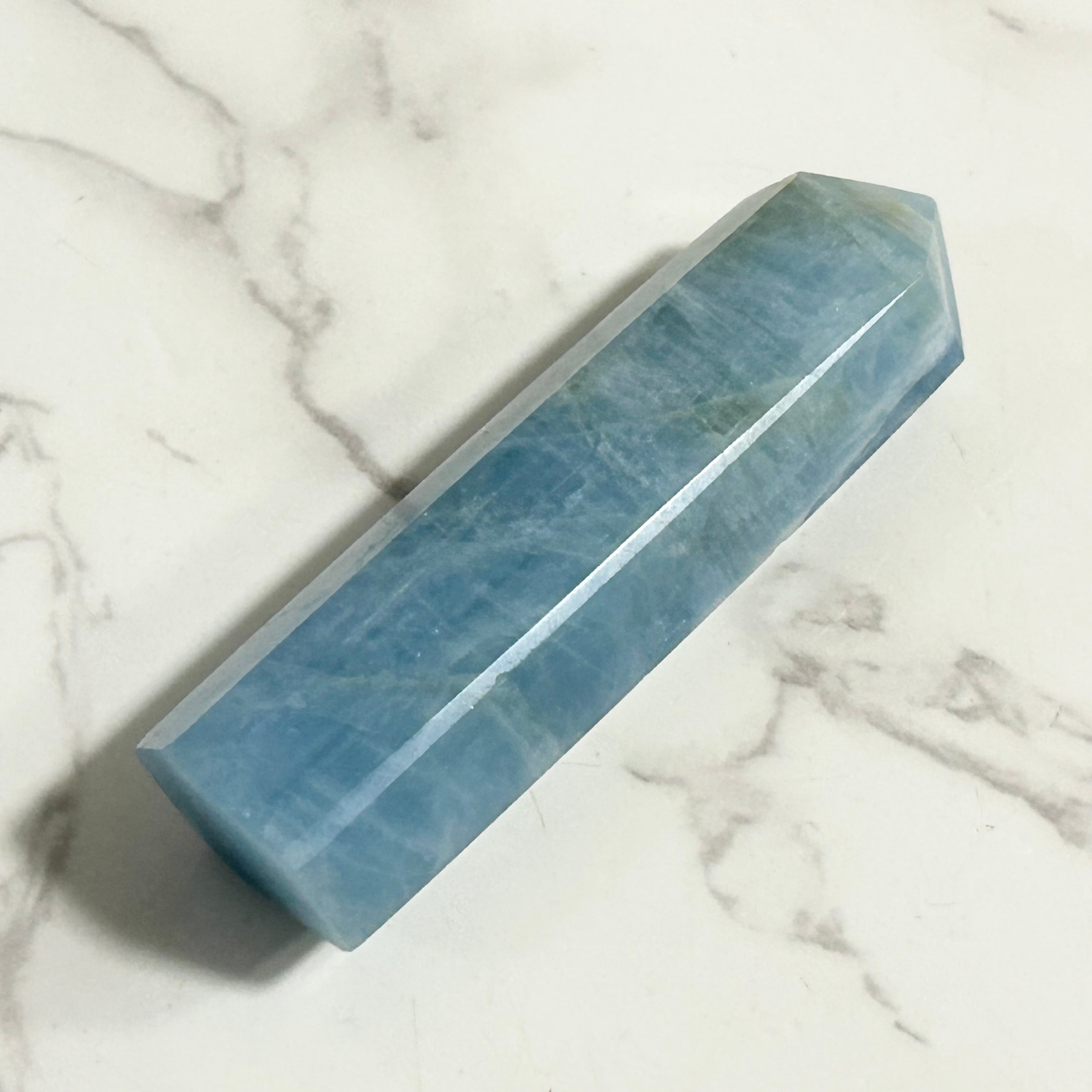 濃いめのブルーにホワイトか混ざり合い、青空のようなカラーのアクアマリンタワーです。キラキラのラメのような輝きも見られます。下部が1ヶ所、斜めにカットされているデザインです。