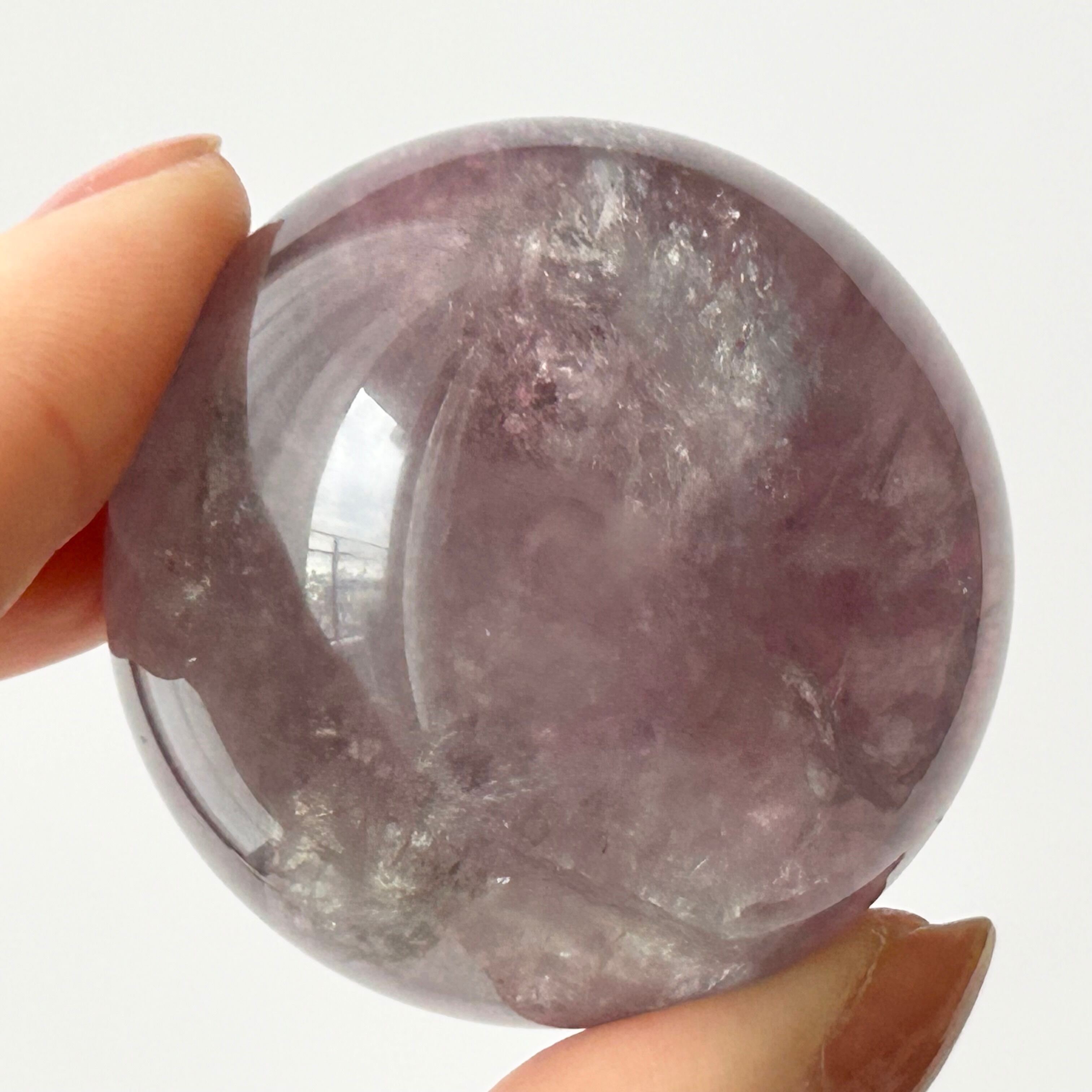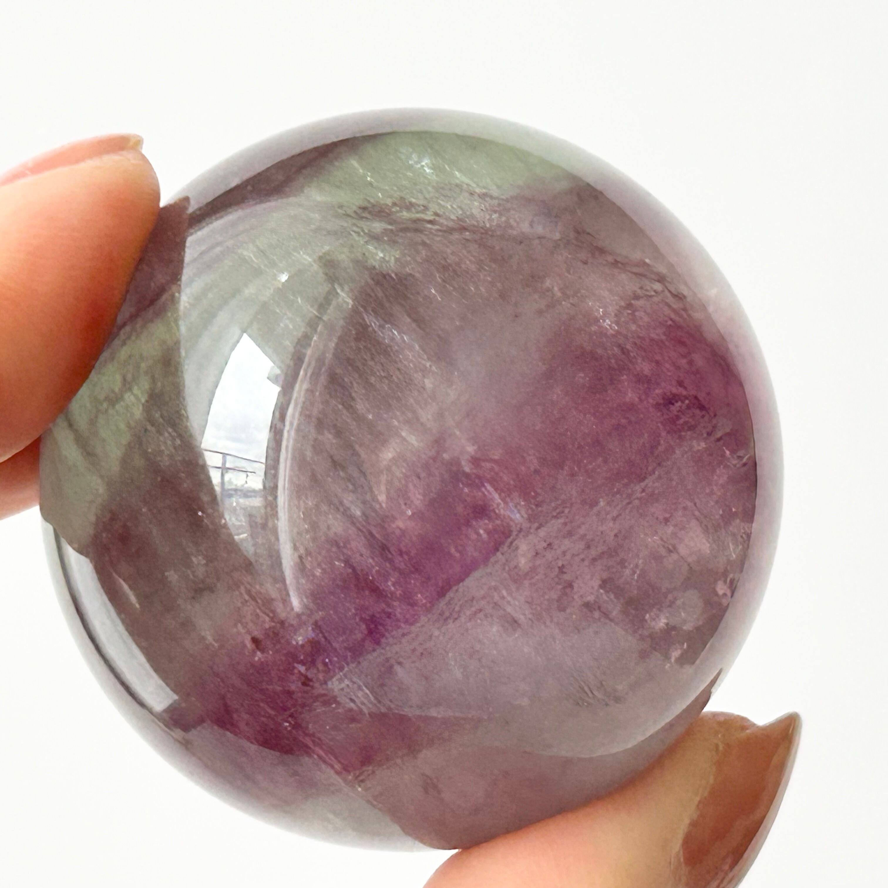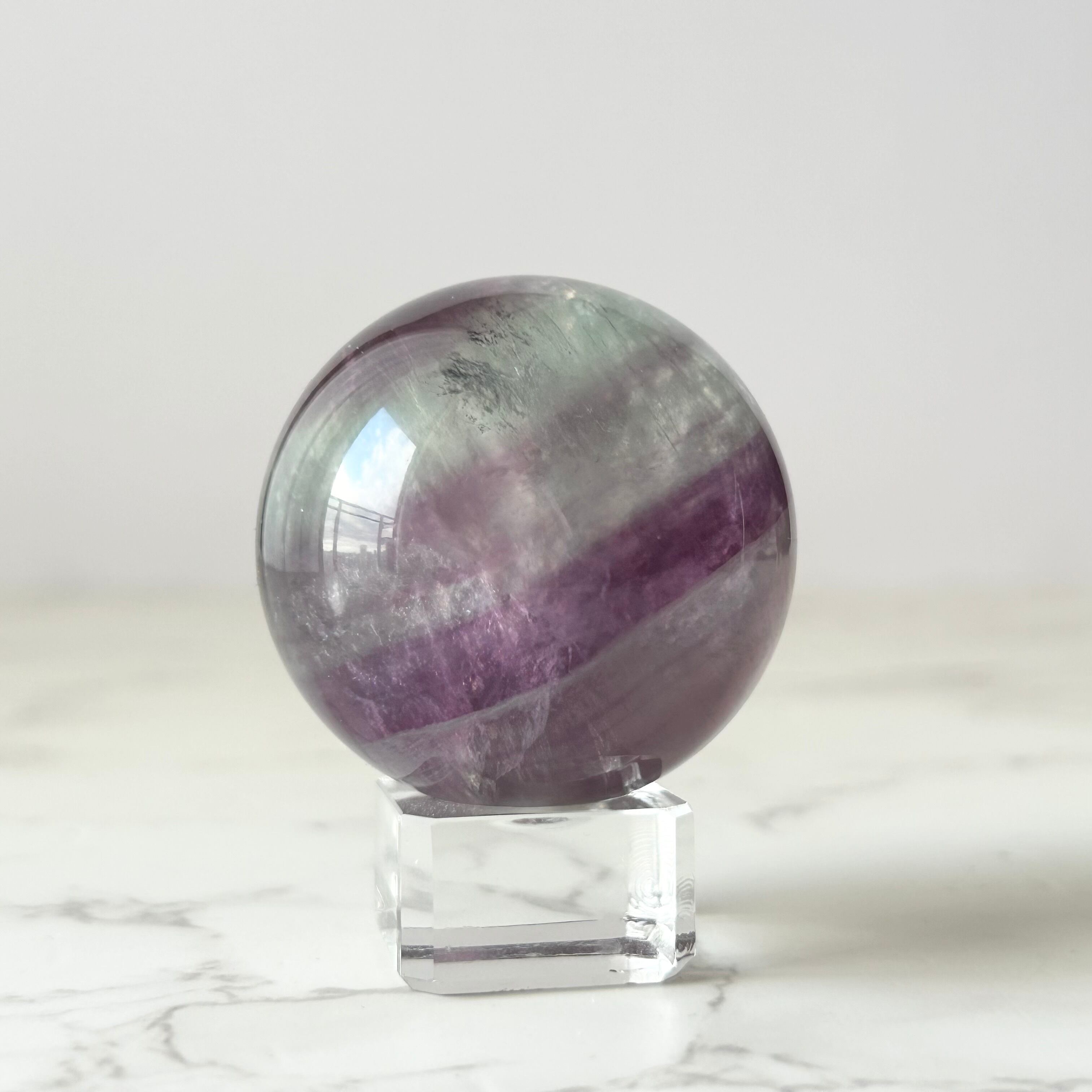 パープルとミントグリーンが織りなす縞模様が素敵なフローライトのスフィアです。レインボーも見られます。クリアガラスのスフィアスタンド付きです。