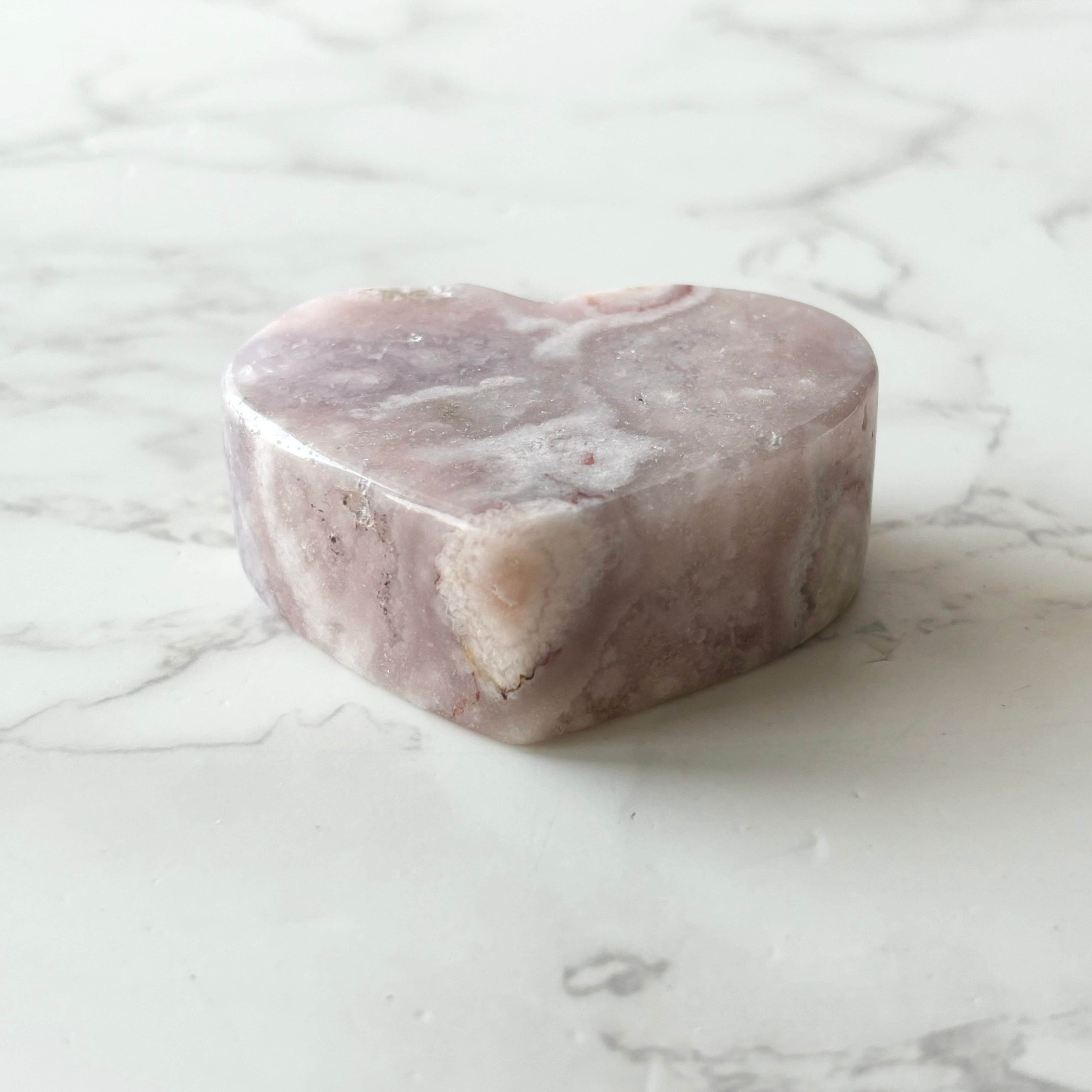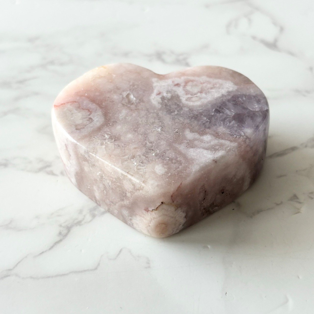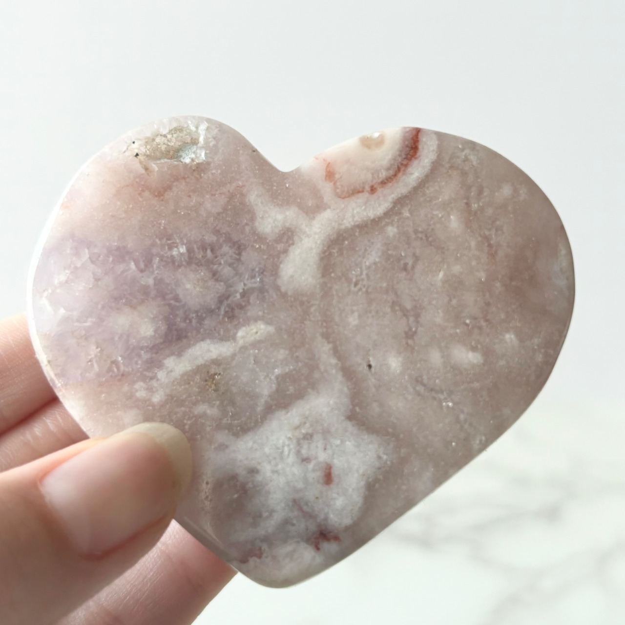 ピンクアメジストにフラワーアゲートが共生しています。スモーキーなピンクとグレーが混ざり合ったような色味も、ハートの形もとても可愛いです。