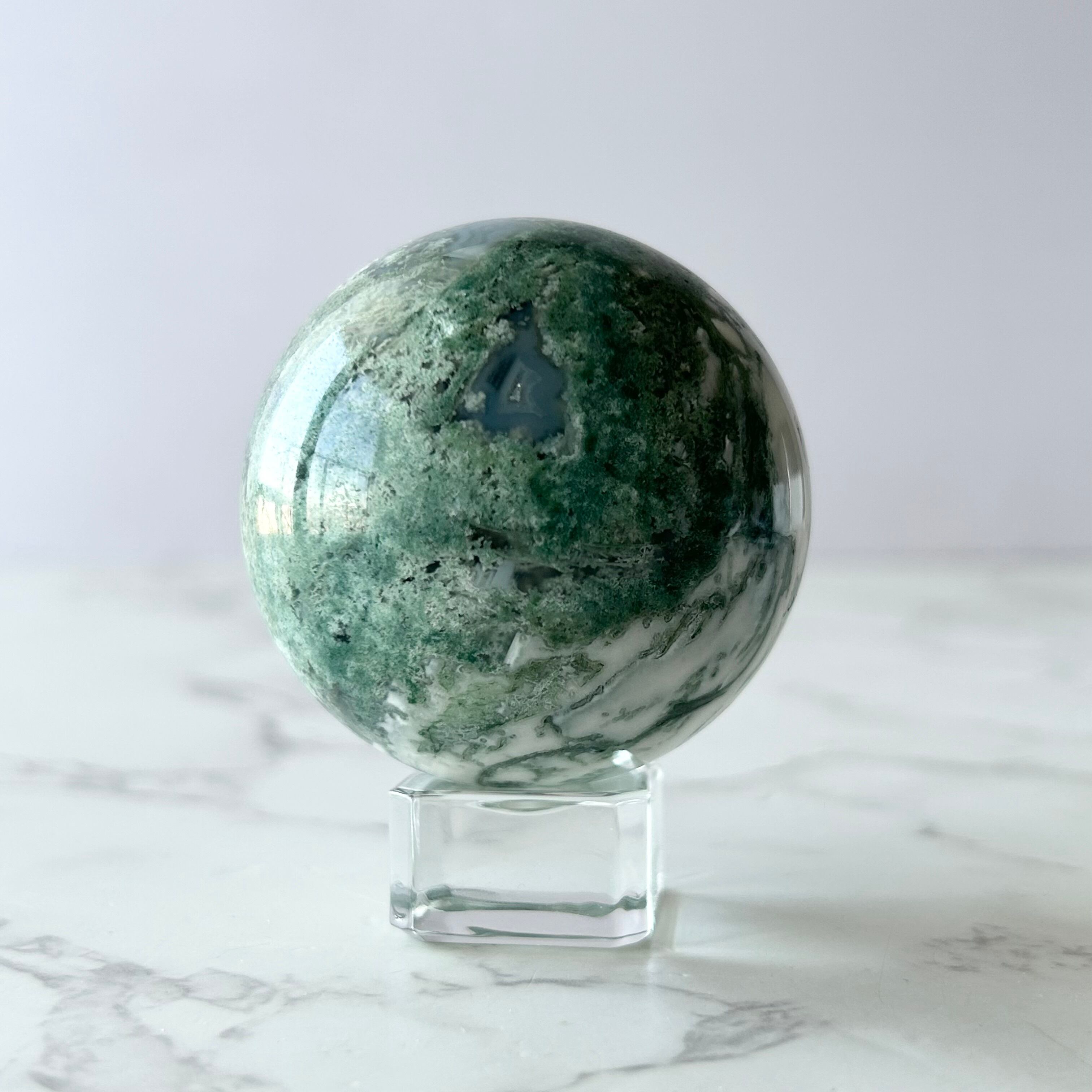モスアゲートのスフィアです。クリアガラスのスタンドをお付けします。