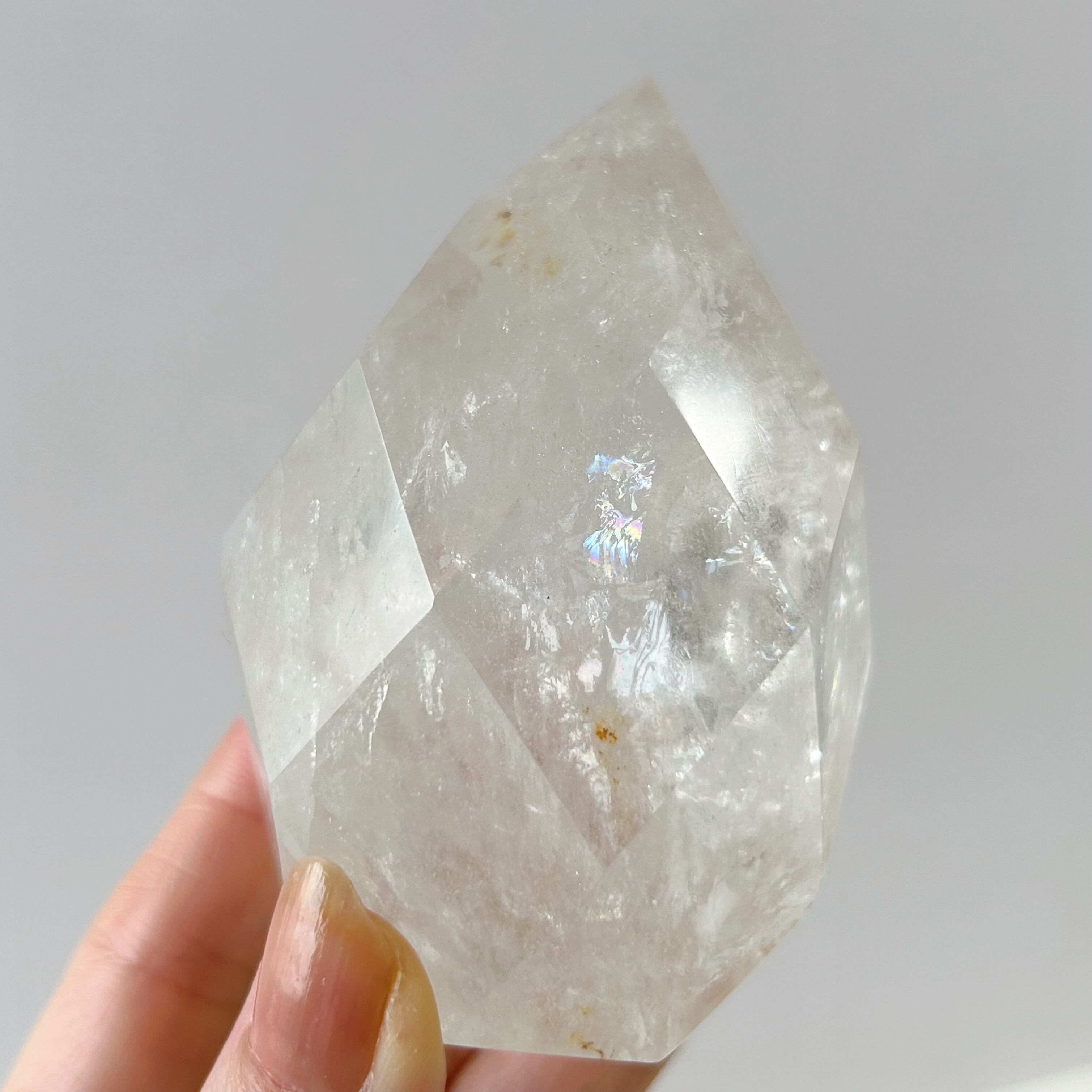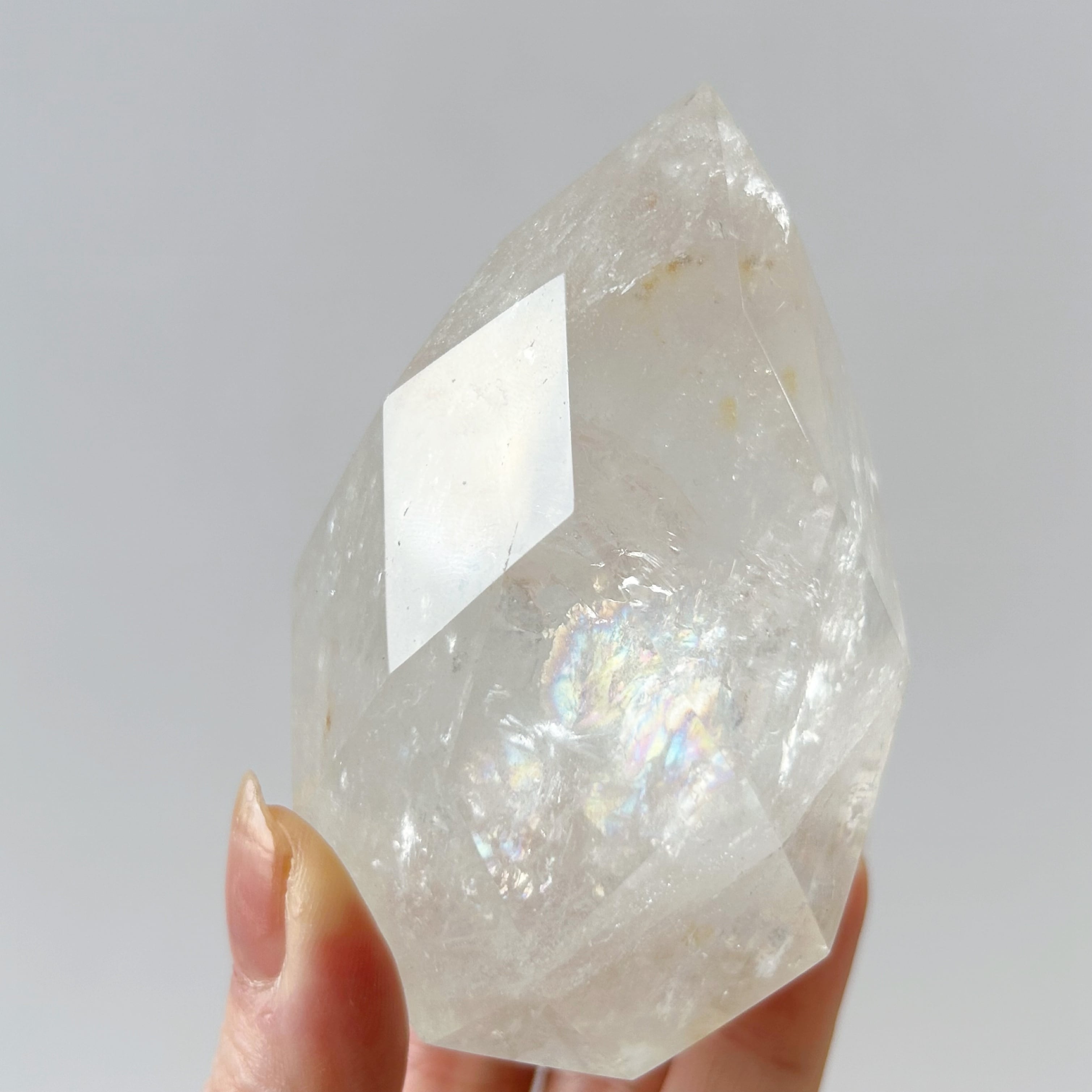 ブラジルのバイーア州セントセ産のレムリアンシードをドロップ型にカットし、ファセットカットを施しました。内部のレインボーがキレイです。