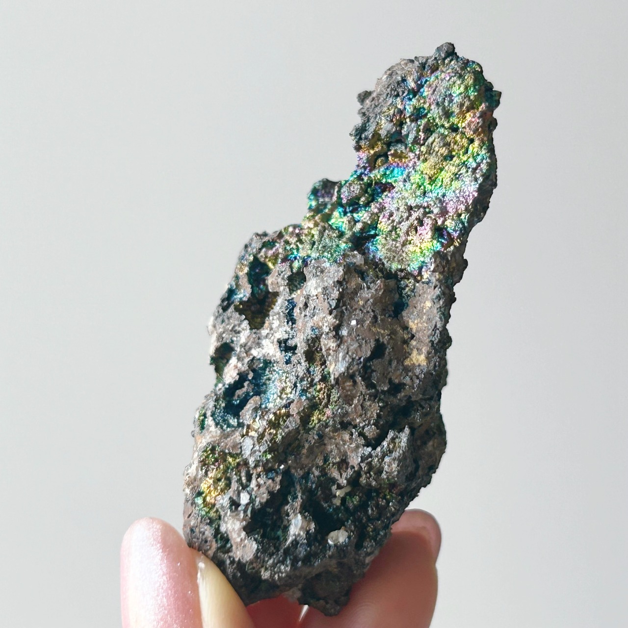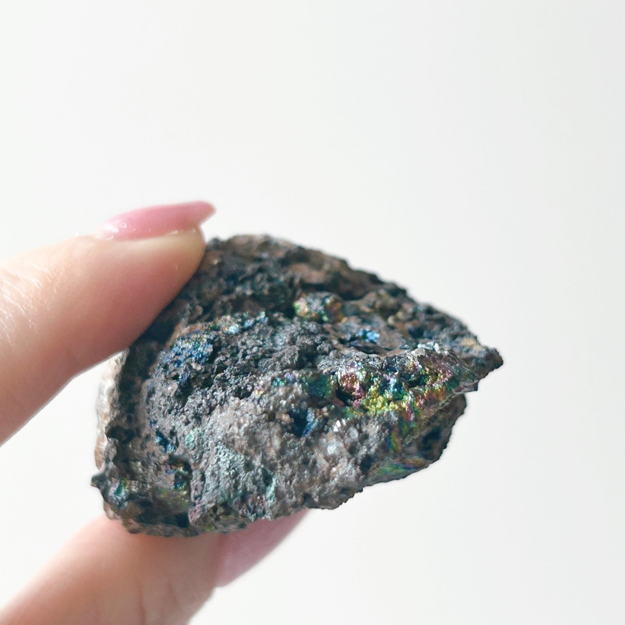 褐鉄鉱系鉱物の表面が酸化して虹色に光っています。
